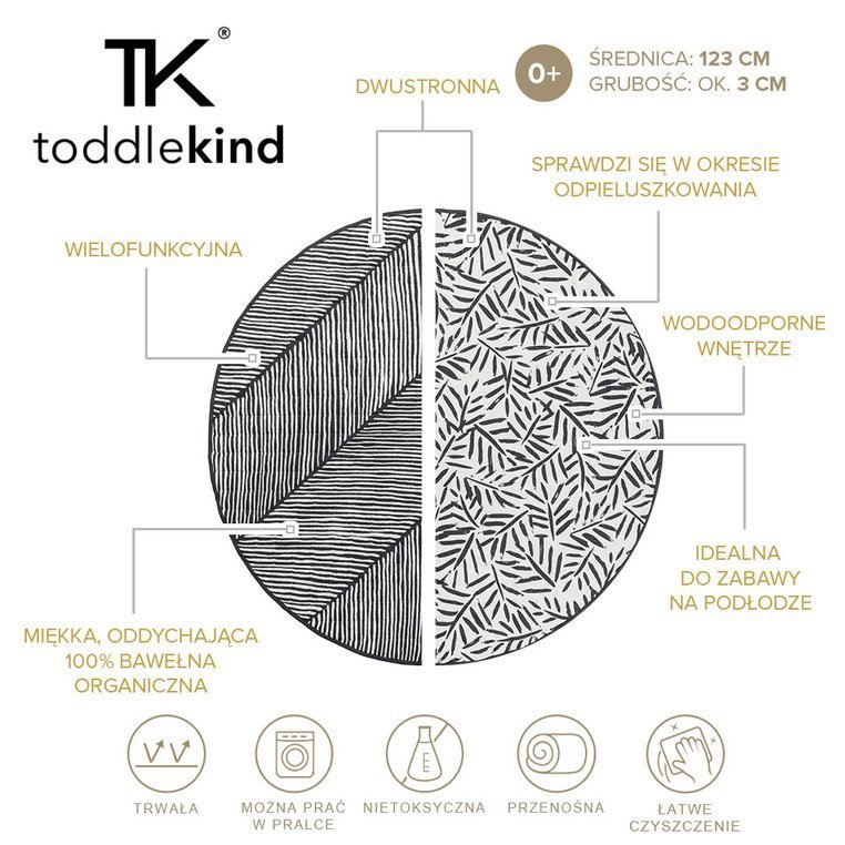 Dwustronna mata do zabawy Nappy Free Playmat z bawełny organicznej angielsko-niemieckiej marki Toddlekind to praktyczne rozwiązanie, zapewniające komfortowe i bezpieczne podłoże do zabawy, drzemki czy innych aktywności dla dzieci i niemowląt już od pierwszych dni życia!