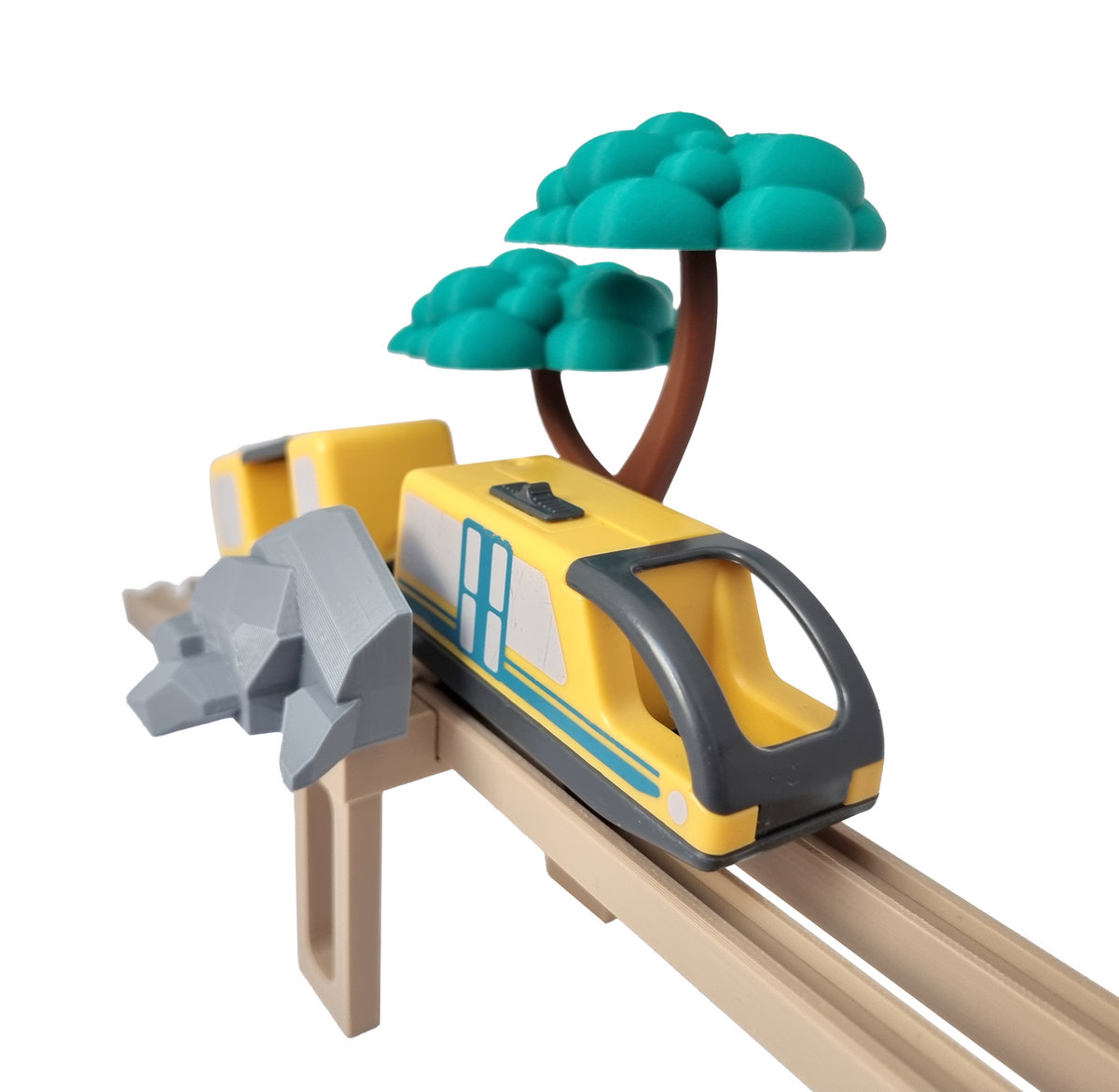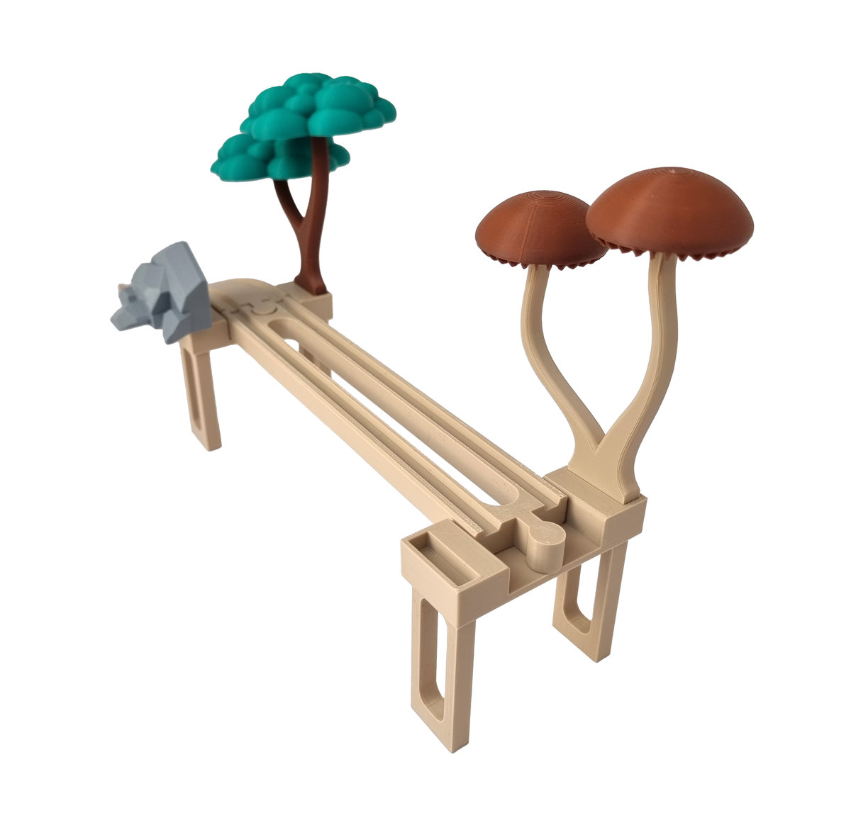 Każdy element drukowany jest w technologii 3D z wysokiej jakości biodegradowalnego filamentu PLA. Kolor imituje drewno użyte przez producentów torów drewnianych, dzięki czemu zestaw świetnie komponuje się z klasycznymi torami. Druk 3D zapewnia wyjątkową precyzję, a jednocześnie nadaje zabawce unikalny, rzemieślniczy charakter. Każdy element jest tworzony w Polsce – od projektu po produkcję.