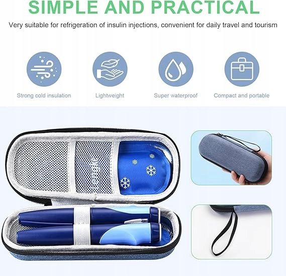- Kompaktowy i przenośny: torba chłodząca na insulinę ma wymiary około 20 x 7 x 5 cm i jest idealna do codziennego użytku, w podróży służbowej, na wycieczki i na kemping. Nadaje się do przechowywania strzykawek do insuliny, wstrzykiwaczy do insuliny, igieł do insuliny i wielu innych.