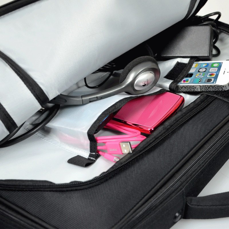 - zestaw dedykowanych przegródek i wydzielonych kieszeni, które mogą pomieścić iPad lub tablet do 10.1"