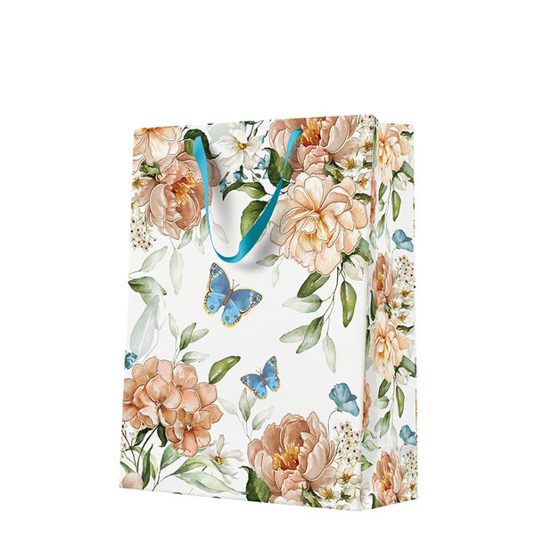 Torba prezentowa wykonana z papieru.Produkt w kolorze białym, zdobiony niebieskimi motylami oraz kwiatami.Wymiary: 30x41x12 cm.