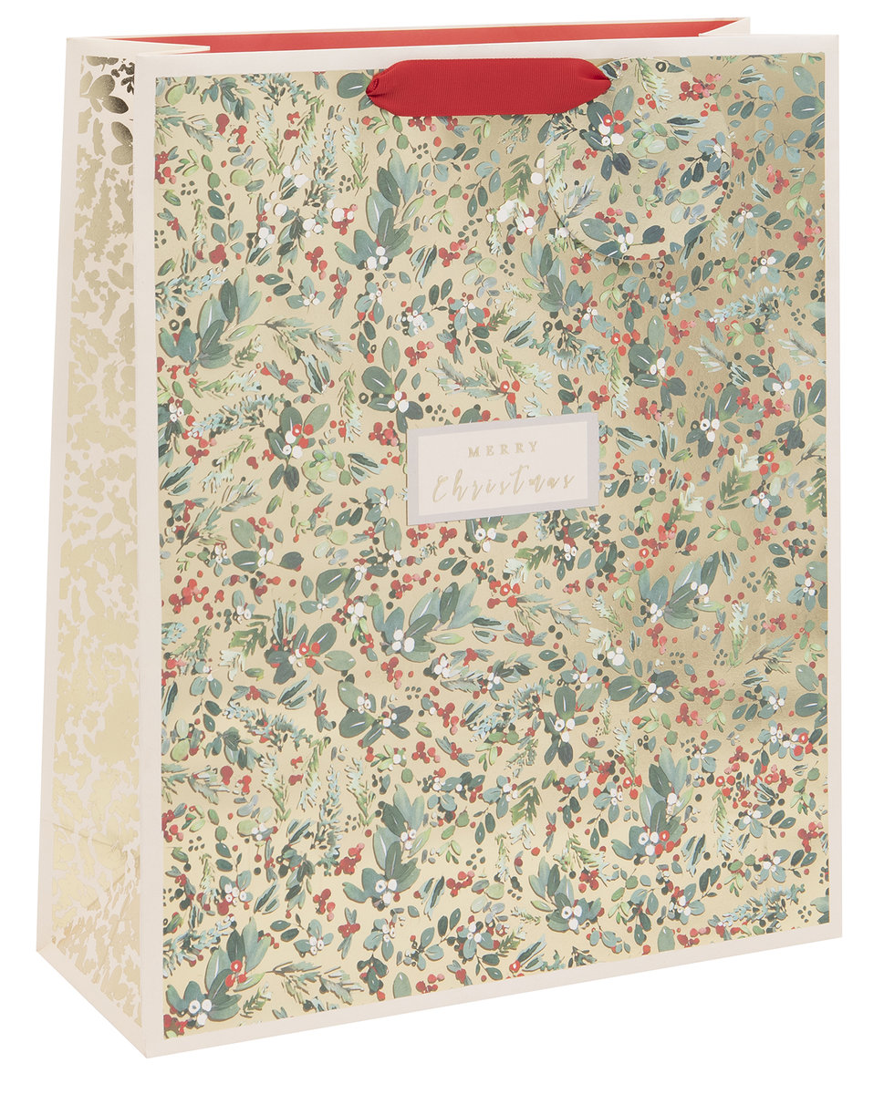torba prezentowa motyw: Świąteczny uchwyty wykonane z tasiemek rozmiar: XL wymiary w opakowaniu(wysokość x szerokość): 40x32 cm kolor główny: kremowy, zielony