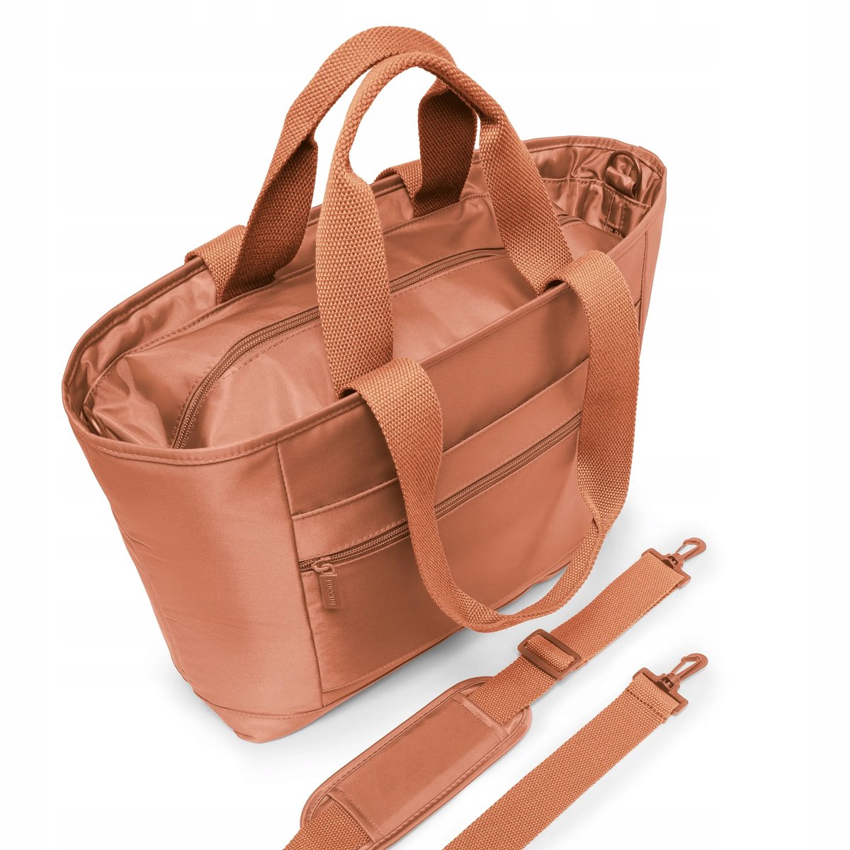 Przemyślana konstrukcja torby tote została wyposażona w dwa rodzaje uchwytów: krótszy i dłuższy. Do modelu został również dołączony odpinany, materiałowy pasek z możliwością regulacji. Takie rozwiązania pozwalają na noszenie torby według własnych upodobań: w dłoni, na przedramieniu, na ramieniu lub crossbody.