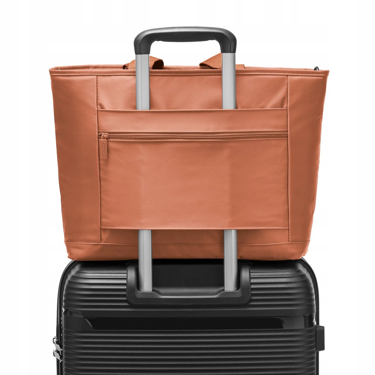 Praktyczny fason posiada również szeroki pas umożliwiający założenie go na stelaż walizki, co znacznie ułatwia transport większej liczby bagażu. Wielofunkcyjna i wytrzymała torba tote zachwyca również swoim designerskim wyglądem. Klasyczny krój i ponadczasowa forma sprawiają, że model idealnie sprawdzi się w podróży, na uczelni, czy w pracy, to doskonały wybór niezależnie od okoliczności.
