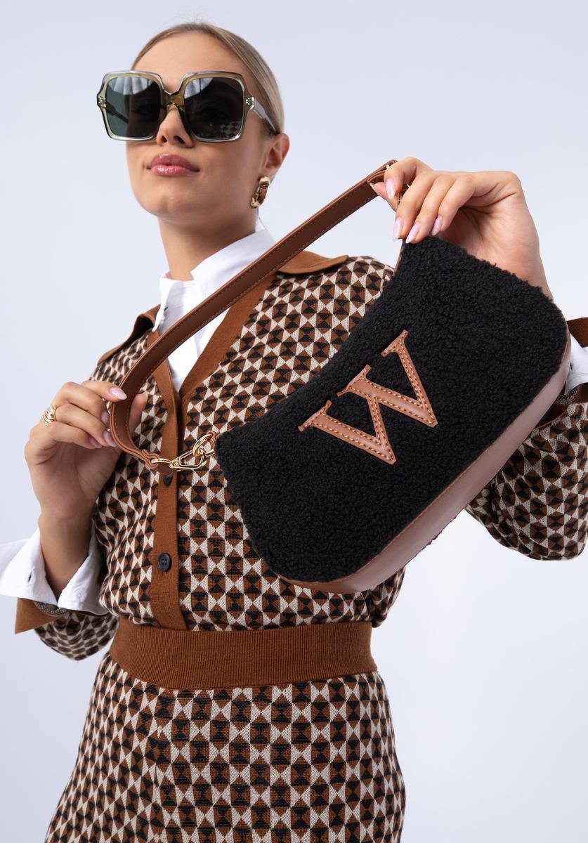 Modna torebka o fasonie bagietki to must have dla każdej stylowej kobiety. Ten model został wykonany z wysokiej jakości skóry ekologicznej. Front oraz tył torebki wykończony jest przyjemnym w dotyku sztucznym futerkiem. Dodatkowo z przodu znajduje się literka „W”. W środku zmieścisz portfel, telefon, mały kalendarz i chusteczki – w sam raz na kawę z przyjaciółką, spacer lub do kina. Dodaj charakteru gładkiej dzianinowej sukience lub noś ją do ulubionych dżinsów boyfriendów i koszulki. Mała torebka bagietka ze sztucznym futerkiem każdego dnia przyciągnie niejedno spojrzenie.Nasza rada: noś ją jak lubisz: na krótkim lub długim pasku.Wewnątrz: