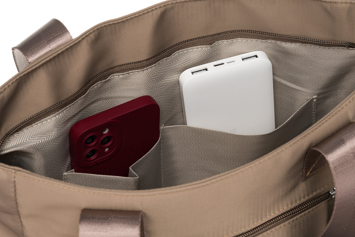 ✅ Główną komorę, która zapewnia przestrzeń na większe przedmioty, takie jak portfel, notatnik czy tablet. W jej wnętrzu znajdują się 2️⃣ przegródki oraz 1️⃣ zasuwana kieszeń.