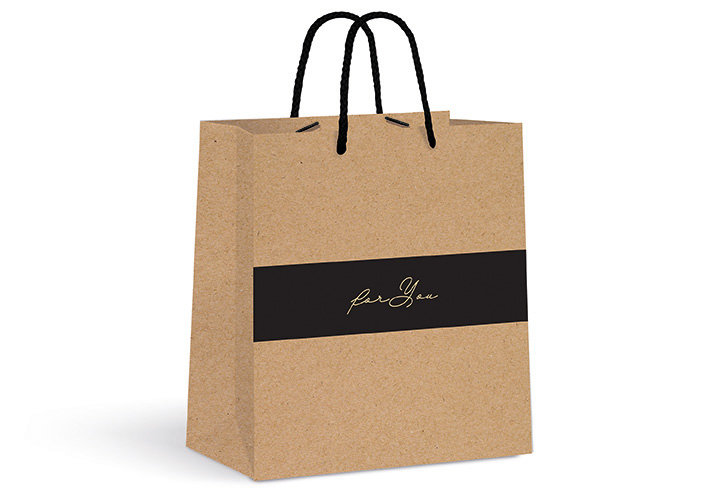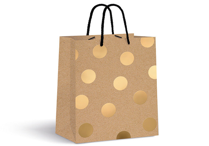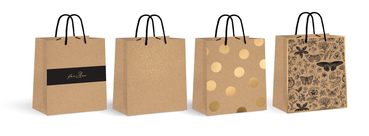 • Naturalny papier kraft ze złotymi zdobieniami • Wzmocniony, sztywny spód • Uchwyty z czarnego sznurka • Wymiary: 26,5x33x13 cm • 4 wzory Wzór wysyłany losowo