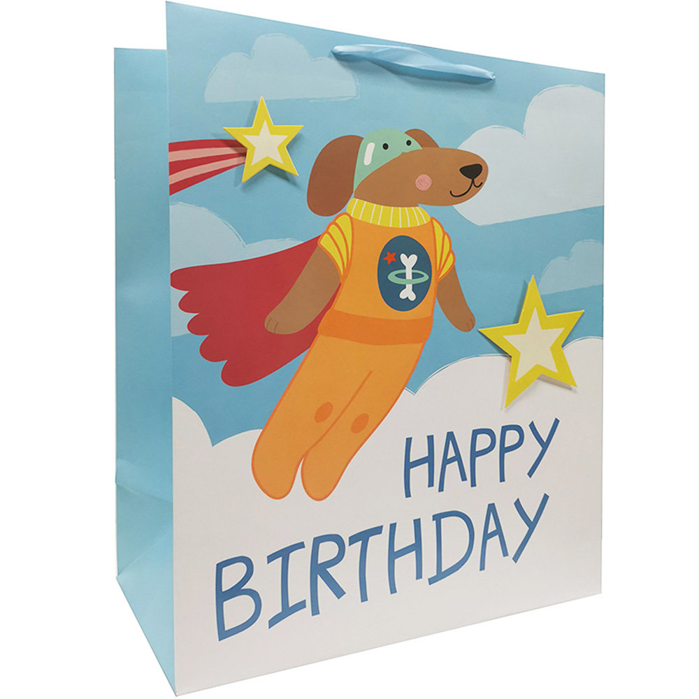 Urodzinowa torebka prezentowa Super Pies – Jumbo - nadruk z folii UV i gwiazdkami 3D z jednej strony, druga strona matowa, - wzmocniony, sztywny spód, - rodzaj uchwytu: wstążka - wymiary ...