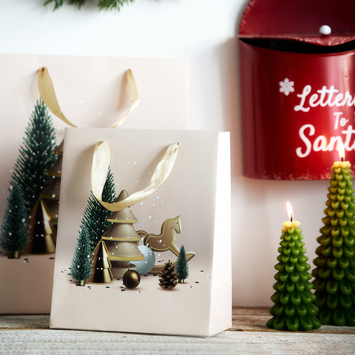 Torebka prezentowa CYMKA ma delikatny, beżowy kolor. Ozdobiona jest grafiką przedstawiającą kompozycję, która składa się z kilku ozdób świątecznych, między innymi choinek, bombek i konika na biegunach. Elementy na beżowej torbie utrzymane są w kolorze złotym, zielonym i białym. Torba wyposażona jest w beżowe tasiemki służące za uchwyty.