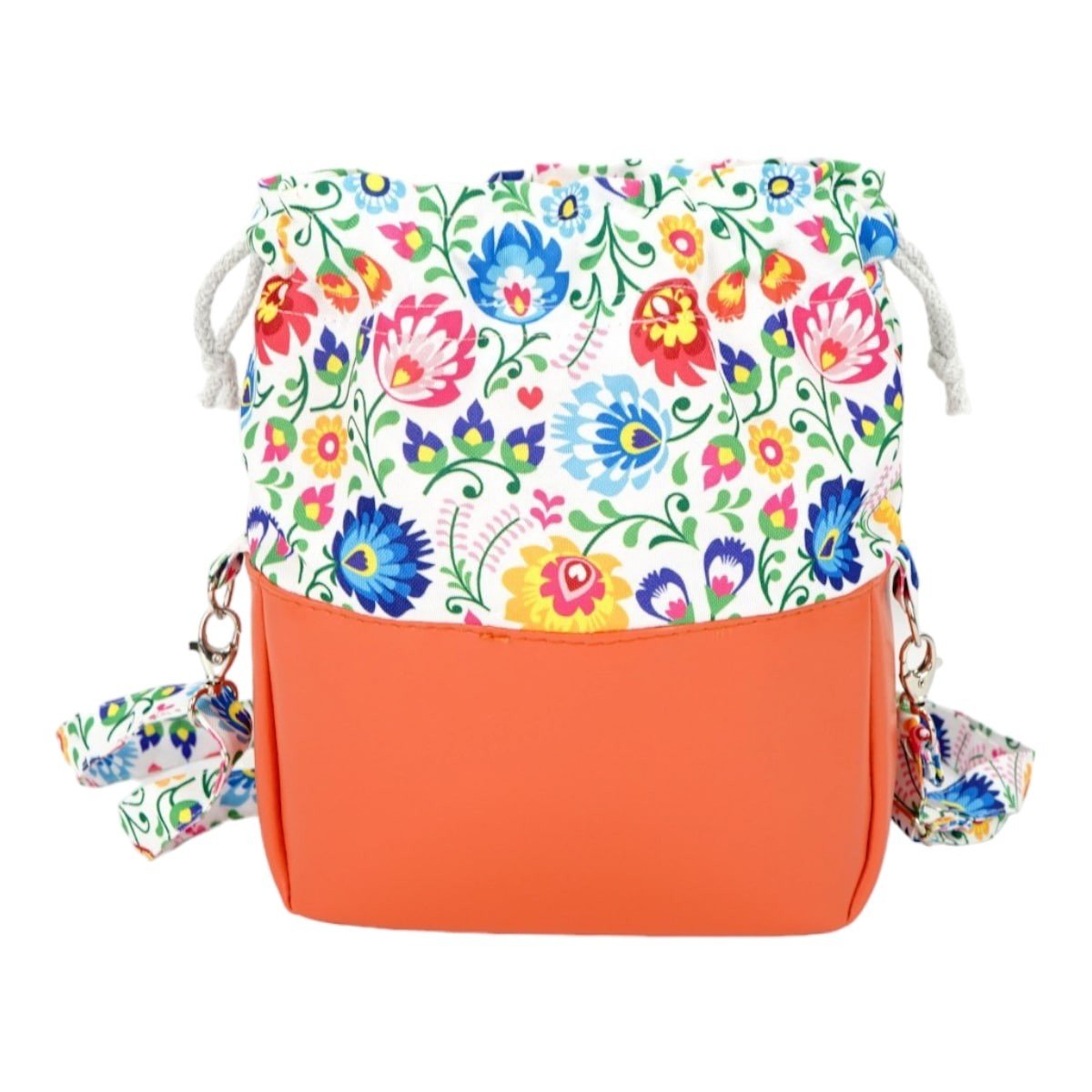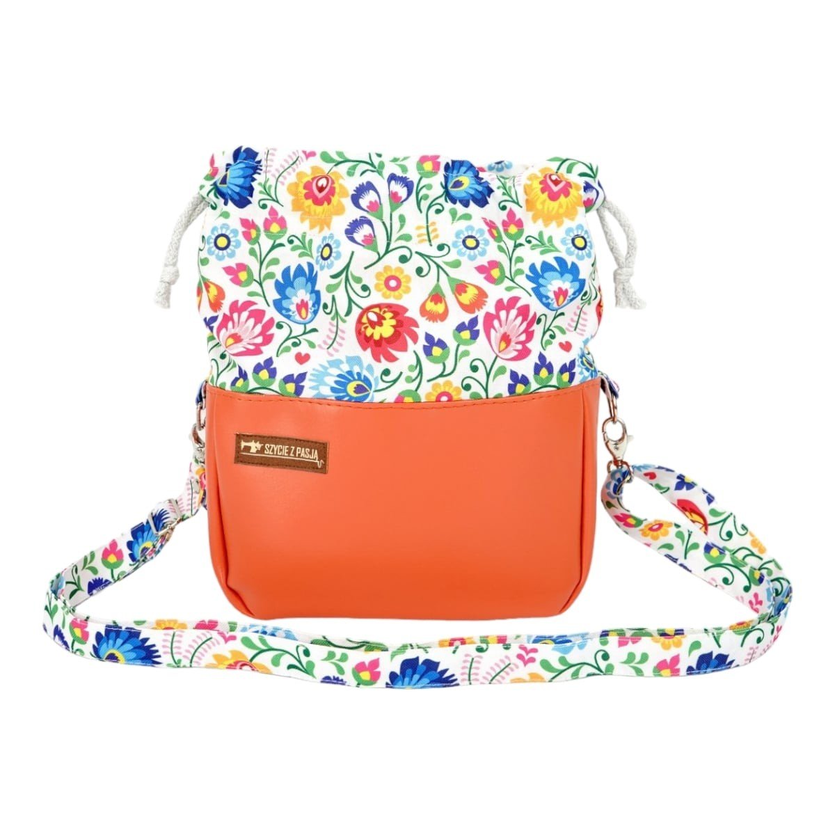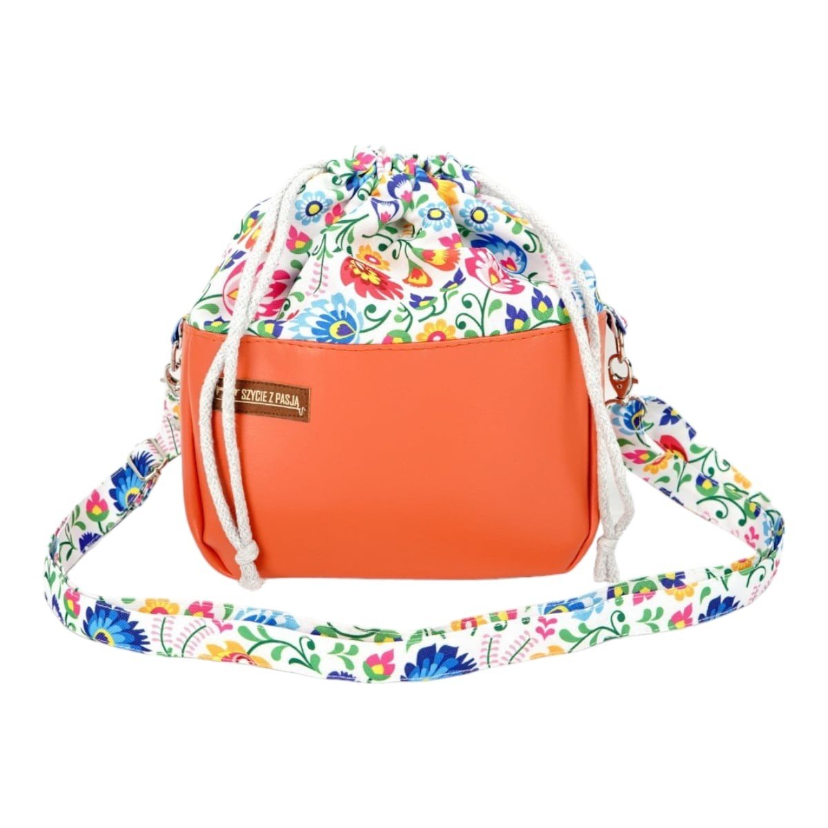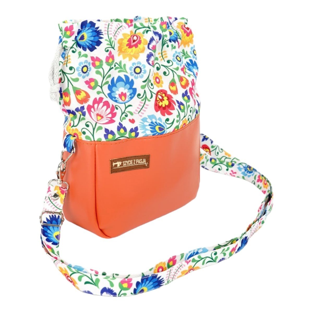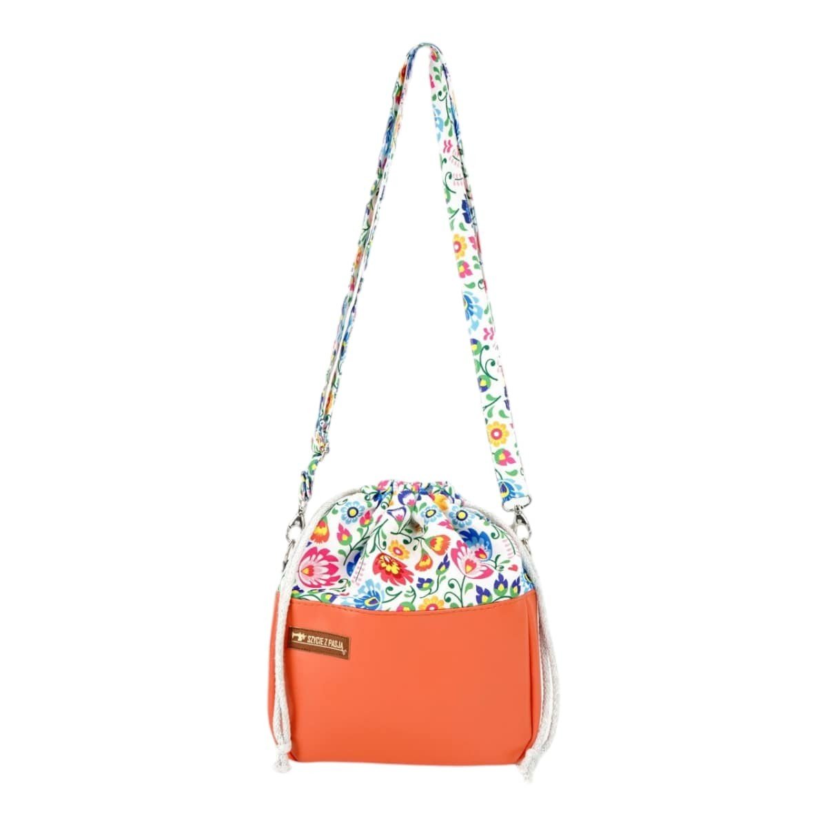 Wierzchnia warstwa wykonana została z trwałego poliestru w intensywnym kolorze pomarańczowym, który przyciąga wzrok. Wnętrze wykończone tkaniną z wzorem łowickim, a pasek – z tego samego materiału – podkreśla całość i nadaje torbie wyjątkowego uroku.