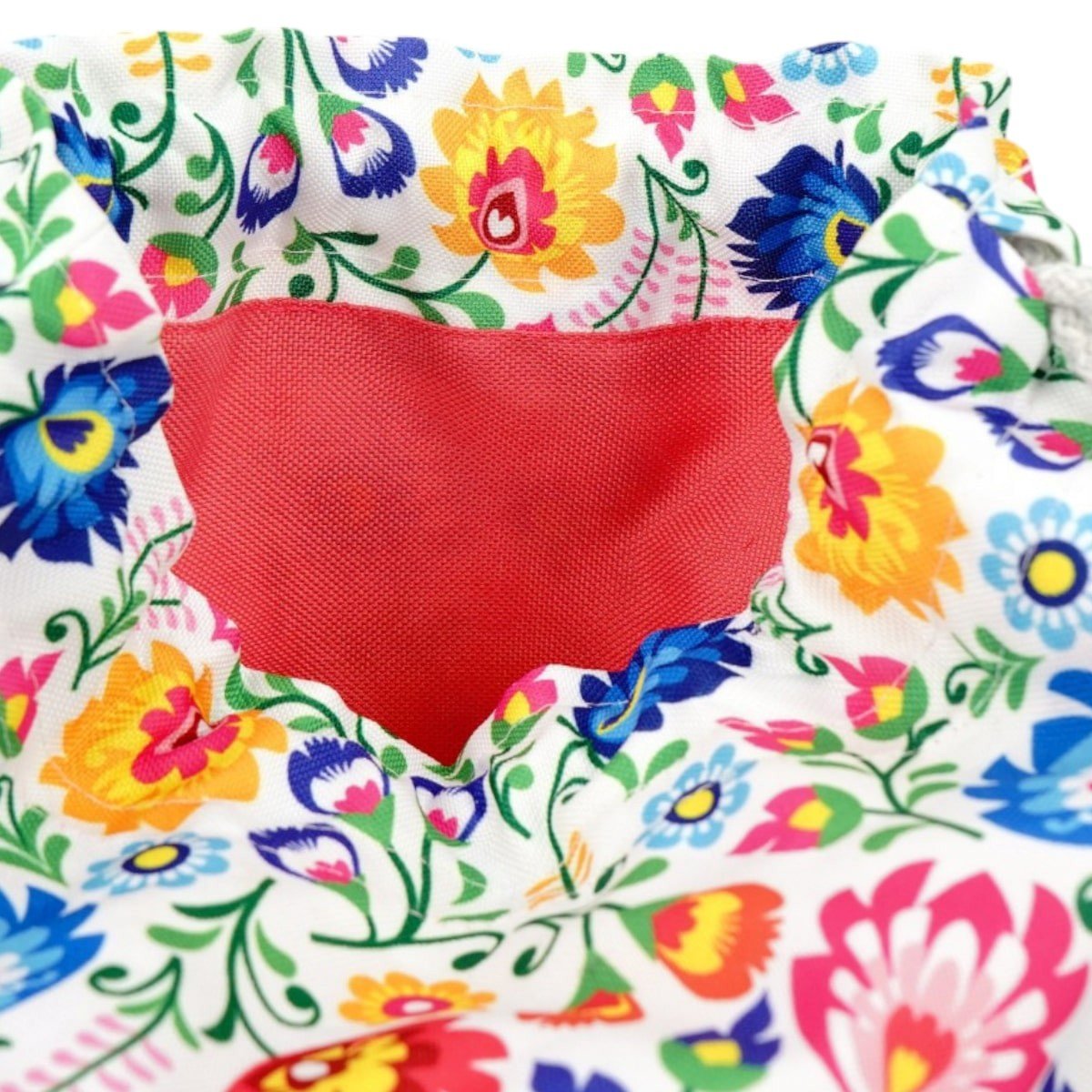 Ta mała torebka na sznurek z kulturowym motywem łowickim to połączenie funkcjonalności i unikalnego designu inspirowanego polską tradycją. Świetnie sprawdzi się zarówno podczas codziennych wyjść, jak i jako oryginalny akcent w stylizacji na specjalne okazje.