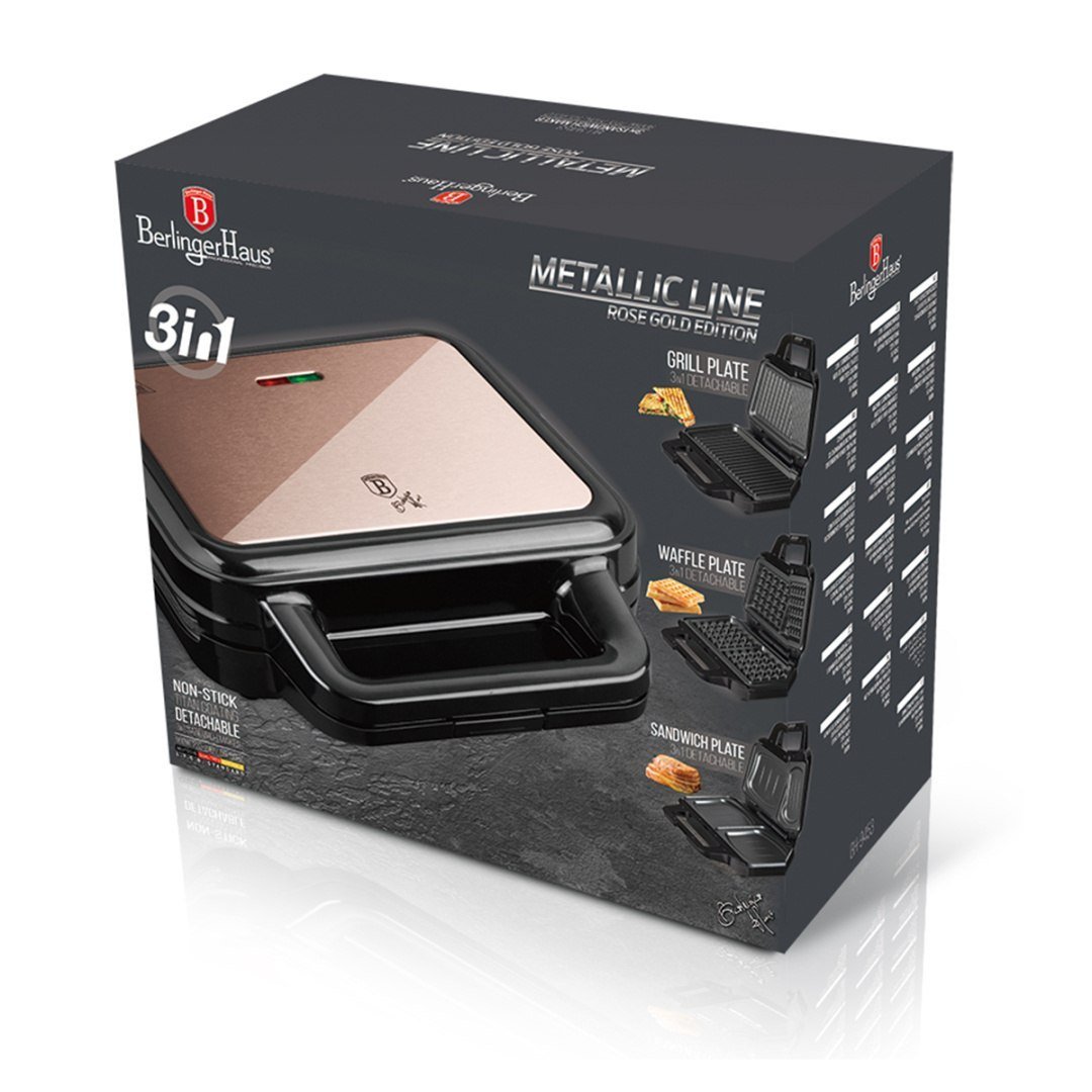 Elegancki i nowoczesny trzy funkcyjny elektryczny toster, grill, opiekacz firmy Berlinger Haus dedykowany dla linii Black Rose i Rose Gold. Idealnie b��dzie pasowa�� do naczy�� i akcesori��w kuchennych tej firmy. Pozwoli przygotowa�� bez dodatku t��uszczu steki, kie��baski, warzywa lub ryby. Mo��emy wykorzysta�� go do zrobienia tost��w czy kanapek na ciep��o a tak��e gofr��w. Wszystko dzi��ki zestawowi 3 wymiennych p��yt pokrytych pow��ok�� nieprzywieraj��c��.