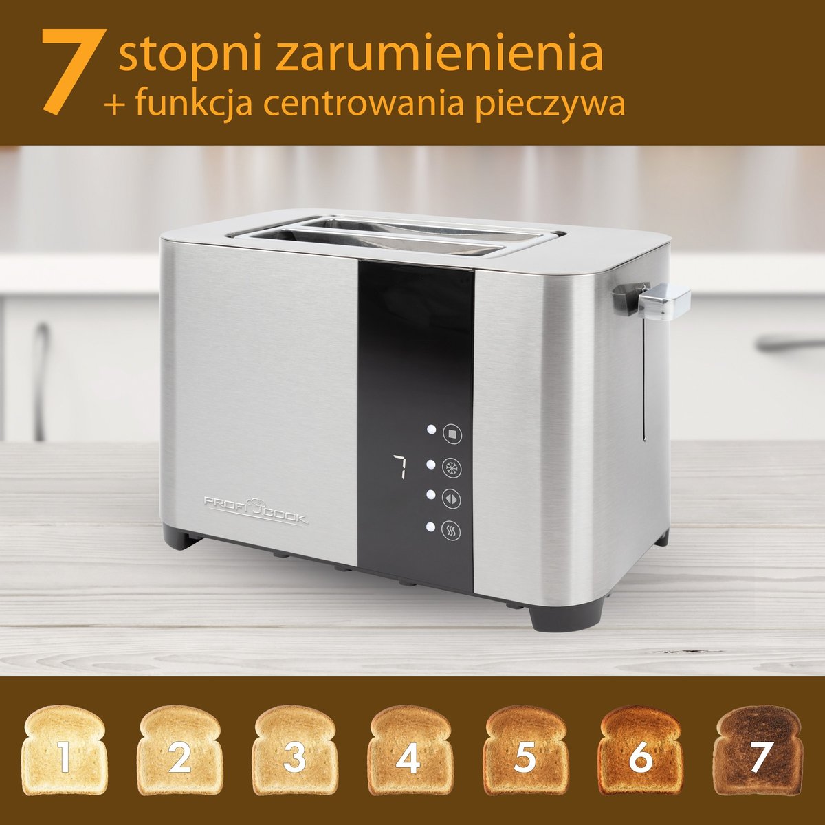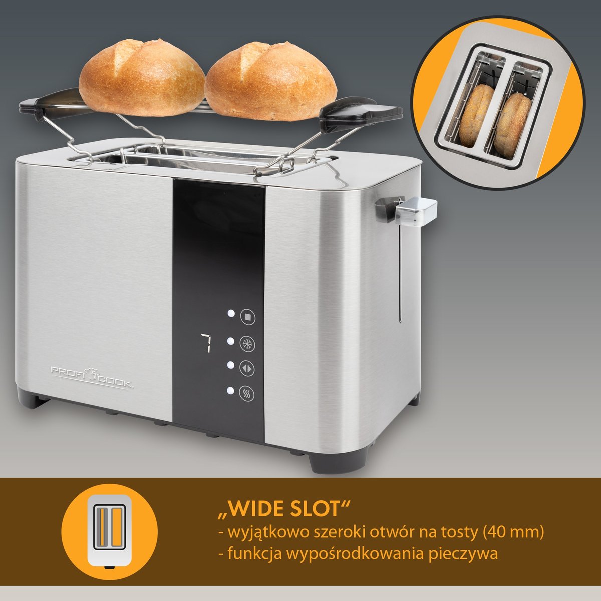 ProfiCook PC-TA 1250 to urządzenie niezbędne do przygotowania pysznych, chrupiących tostów i grzanek. Obudowa została wykonana ze stali szlachetnej a sterowanie odbywa się poprzez nowoczesny, panel dotykowy z podświetleniem. Dzięki niemu możesz wybrać czynność, którą chcesz wykonać: rozmrażanie, podgrzewanie oraz szybkie zatrzymanie pracy. Szerokie szczeliny na kromki mają aż 4 cm i dopasowują się do opiekanego pieczywa - dzięki temu można przygotować np. bruscettę.