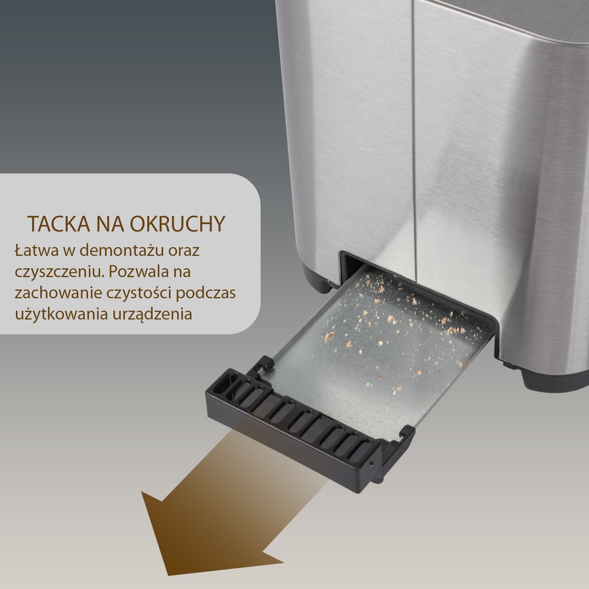 Toster posiada obudowę wykonaną ze stali szlachetnej oraz dotykowy panel sterowania z wyświetlaczem