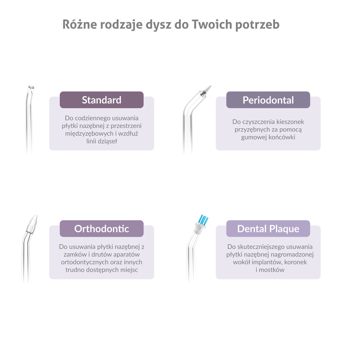 - 6 specjalnych dysz w zestawie: Dysze dopasowane do różnych potrzeb stomatologicznych – w tym dla użytkowników aparatów ortodontycznych czy osób z implantami.