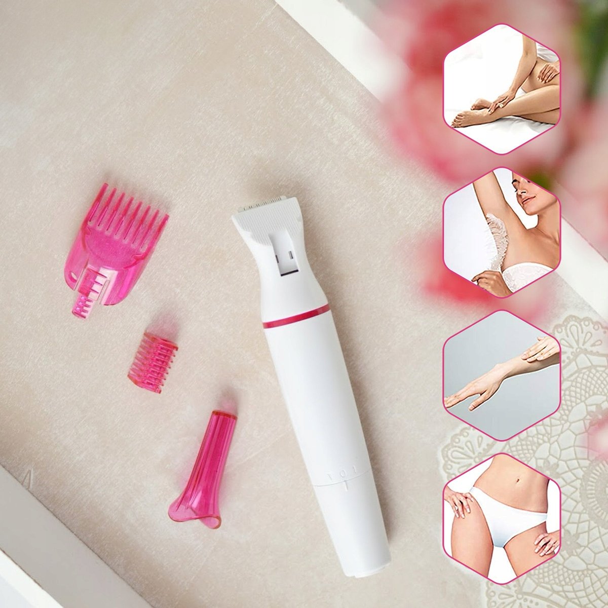 Trymer idealnie nadaje się do depilacji twarzy, pach, okolic bikini oraz innych wrażliwych miejsc, gwarantując dokładne i bezpieczne usunięcie włosków.