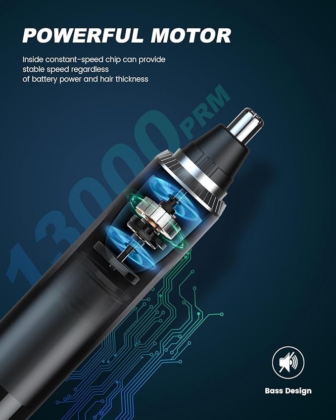 - Trymer do nosa ze stali nierdzewnej jest wyposażony w ulepszony silnik z rdzeniem miedzianym, który dostarcza moc do systemu z podwójnym ostrzem obrotowym o 360° z silnikiem klasy premium o prędkości 13 000 obr./min. Wyposażona w dwustronne ostrza ze stali nierdzewnej o kącie 360°, inteligentnie i precyzyjnie przycina włosy. Zaprojektowano ją tak, aby idealnie pasowała do jamy nosowej, zapobiegając wyrywaniu i uszkadzaniu włosów w nosie. Zapewnia bezpieczniejsze i wygodniejsze cięcie. Trymer do nosa jest wyposażony w specjalnie zaprojektowany port ładowania USB, co znacznie zwiększa wygodę użytkowania.