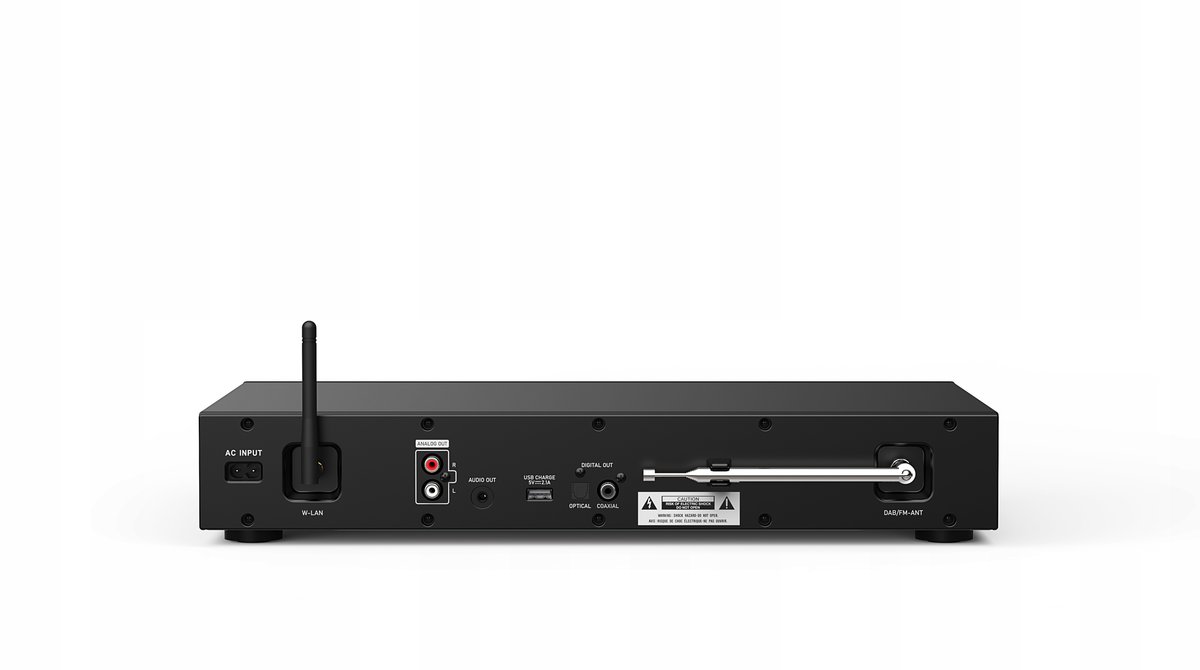 Połączenie z systemem Hi-Fi zapewnia analogowe złącze cinch lub można go podłączyć za pomocą cyfrowego złącza TOSLINK lub sprawdzonego kabla COAX. Do połączenia z Internetem można połączyć się bezprzewodowo za pomocą sieci Wi-Fi lub połączenia Bluetooth.