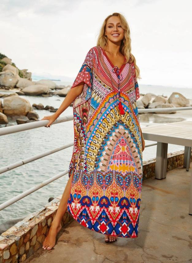 Model doskonale komponuje się z różnymi fasonami kostiumów kąpielowych, dodając im szyku i orientalnego charakteru. Dekolt z wiązaniem zakończonym frędzlami w kolorze czerwonym to dodatkowy akcent, który przyciąga uwagę i podkreśla unikalność kroju.