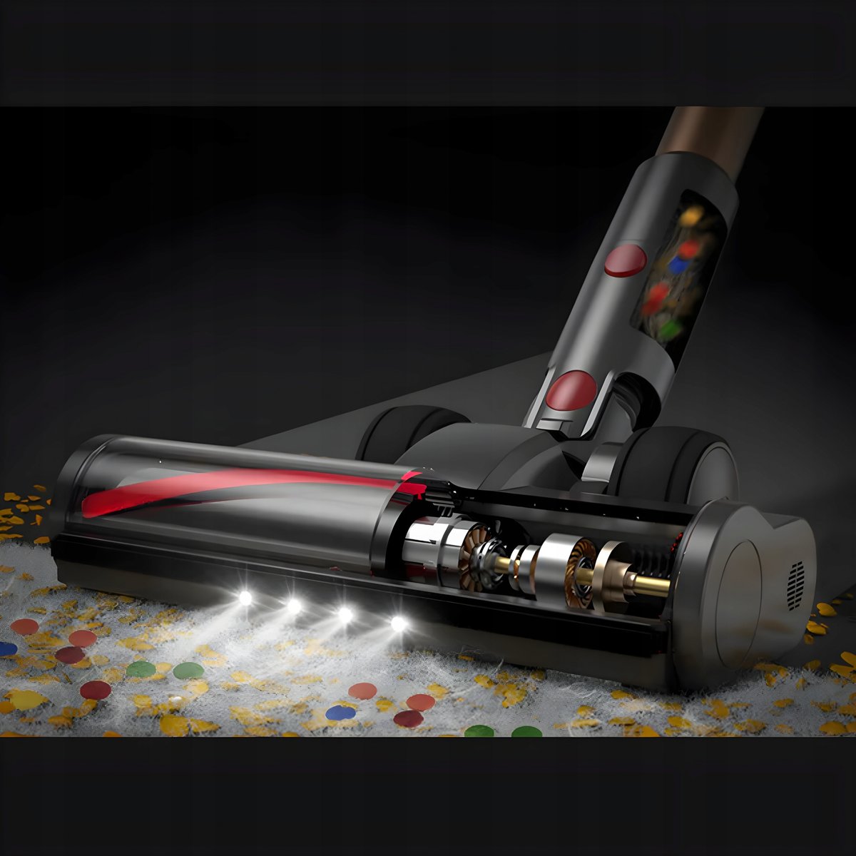 Oświetlenie LED w odkurzaczu, sprawia, że sprzątanie staje się łatwiejsze, umożliwiając dostrzeżenie kurzu i zabrudzeń nawet w słabo oświetlonych miejscach, takich jak przestrzenie pod meblami czy ciemne narożniki.