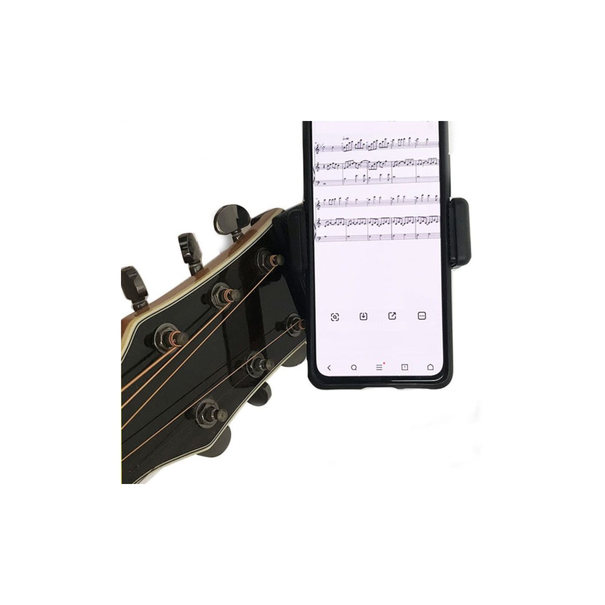 Uchwyt na gitarę lub ukulele wyposażony jest w gumowe elementy antypoślizgowe, które zapewniają stabilne trzymanie na instrumentach. Bezpieczne i pewne mocowanie smartfona na główce instrumentu.