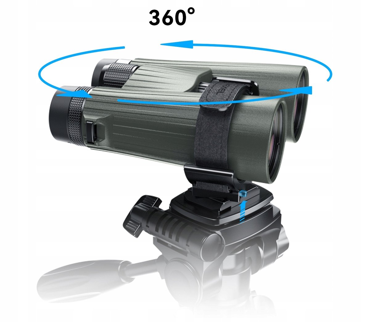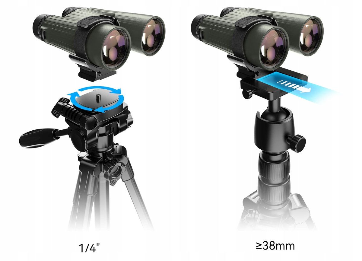 ✏️Uchwyt wyposażony w standardowy gwint mocujący 1/4" oraz płytkę szybkiego montażu Arca-Swiss (38 mm) – umożliwia szybkie i stabilne zamocowanie lornetki na większości uchwytów, statywów fotograficznych, monopodów czy głowic
