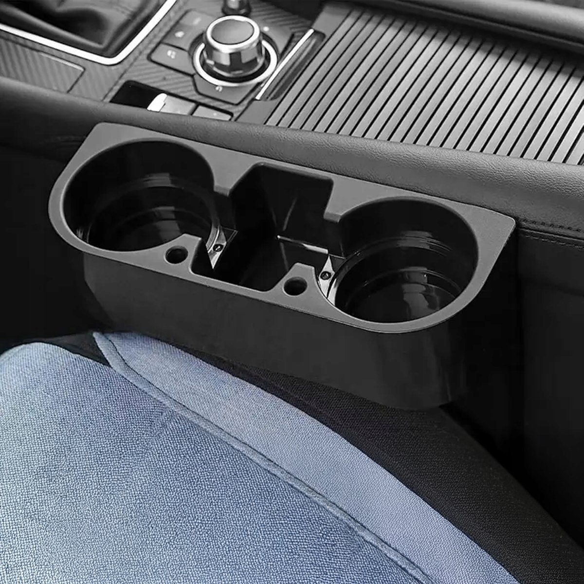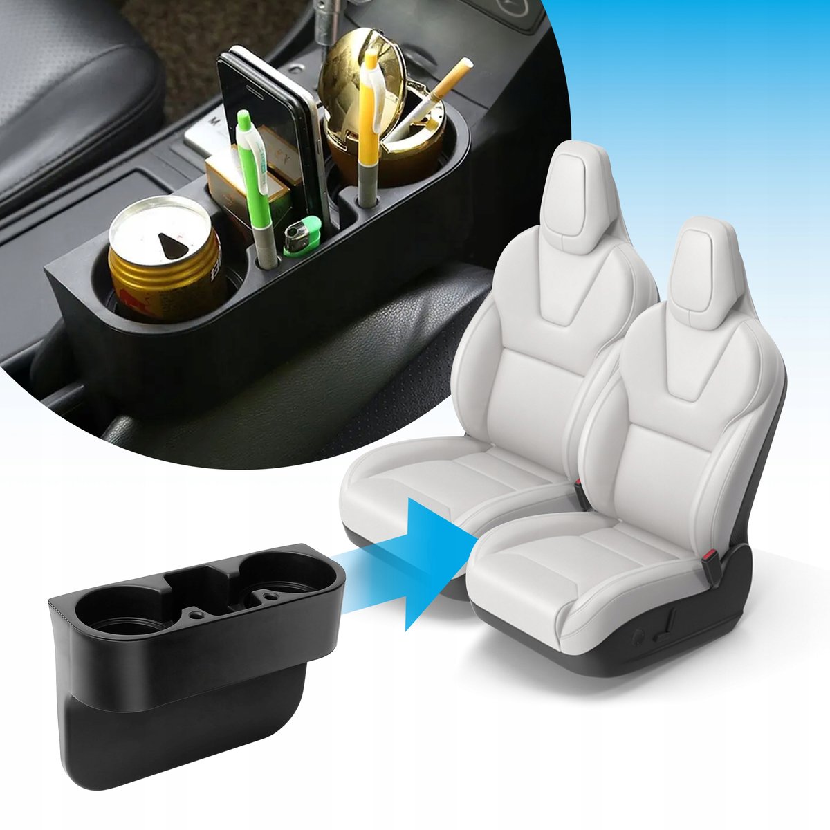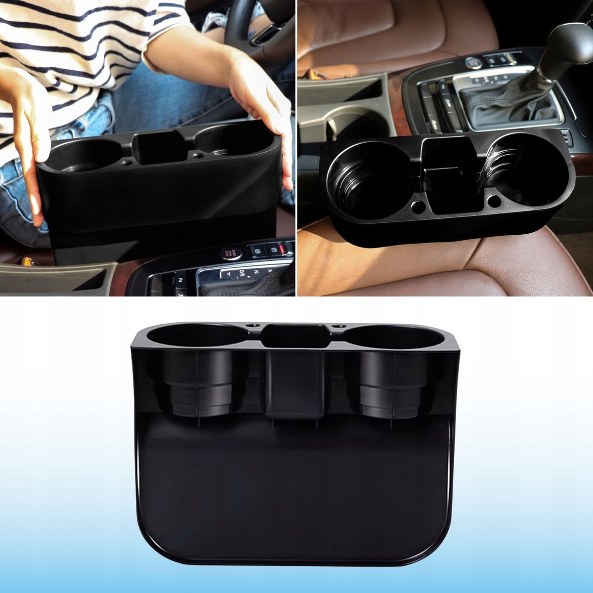 Uchwyt można łatwo zamontować między siedzeniami lub przykleić w dogodnym miejscu. Pasuje do większości modeli samochodów, w tym ciężarówek i pojazdów bez fabrycznych uchwytów na napoje. Jego kompaktowy design nie koliduje z przestrzenią pasażera i nie utrudnia korzystania z pasów bezpieczeństwa.