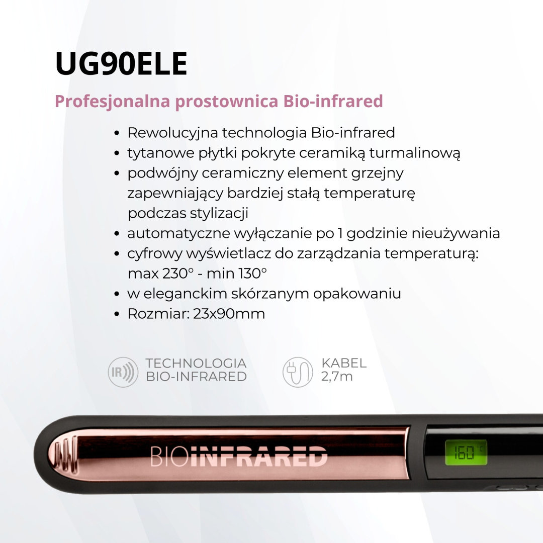 Upgrade UG90ELE to nowa, limitowana edycja profesjonalnej prostownicy Bio-infrared, która łączy w sobie elegancki design i zaawansowaną technologię. Oferując nowatorskie podejście do stylizacji włosów, ta prostownica jest idealnym narzędziem dla każdego fryzjera, który pragnie zapewnić swoim klientom zdrowe i piękne włosy.