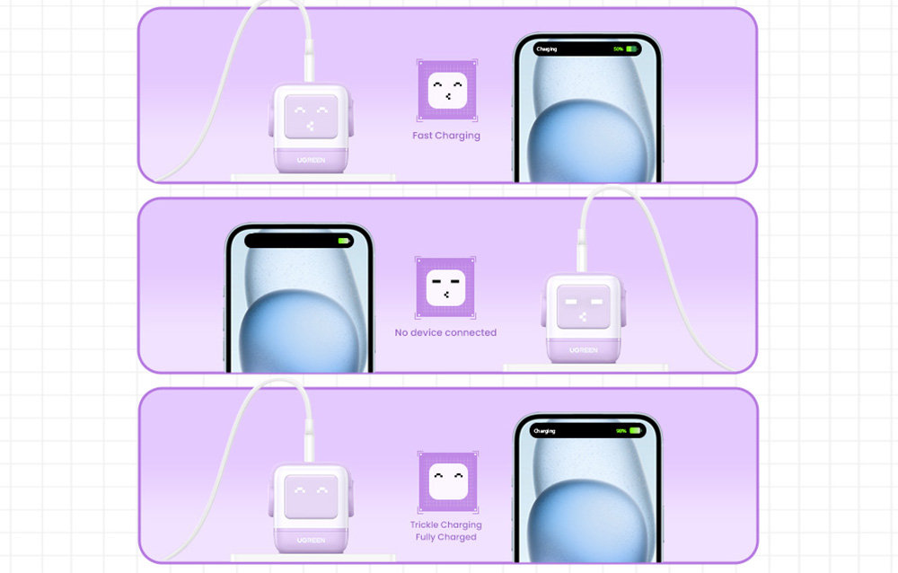 - Inteligentny Wyświetlacz LED: Ładowarka posiada wbudowany wyświetlacz LED imitujący twarz i mimikę robota, dostarczający informacji o statusie ładowania. Dzięki niemu łatwo sprawdzisz, czy aktualnie trwa szybkie ładowanie, czy proces jest w fazie podtrzymywania, bez potrzeby dodatkowej aplikacji.