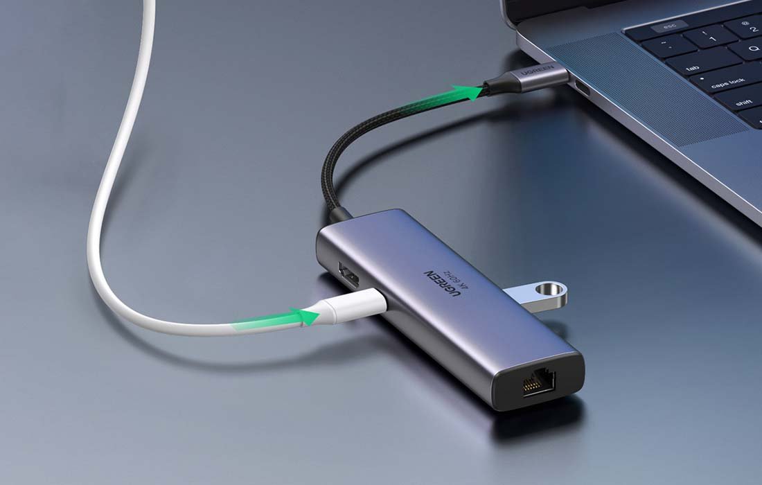 Adapter 6w1 UGREEN CM512 Hub USB-C do 2x USB + HDMI + USB-C + RJ45 + TF/SDobsługa ładowania przez złącze USB-C - Power Delivery do 100W,port RJ45 o przepustowości 1000Mb/sport HDMI przesyłający obraz