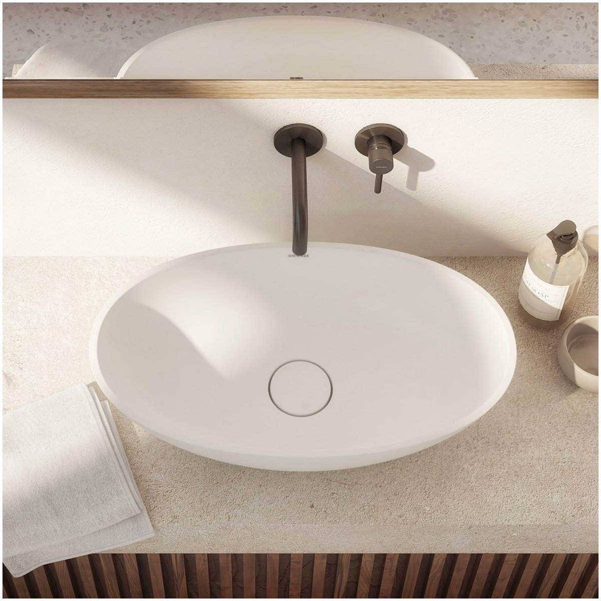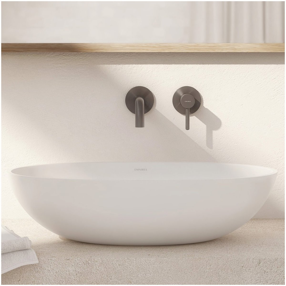 Umywalka nablatowa z kolekcji OMNIRES SHELL M+ charakteryzuje się współczesną eliptyczną formą, która miękką linią zwęża się ku podstawie. Minimalistyczna bryła wygląda lekko a zarazem solidnie, tworząc efekt wyrzeźbionego ze skały monolitu. Wewnątrz umywalki dopasowana maskownica dyskretnie zakrywa odpływ, nie zaburzając przy tym harmonijnie wyprofilowanej sylwetki. Projekt został stworzony przez studio Pawlak&Stawarski we współpracy z OMNIRES.