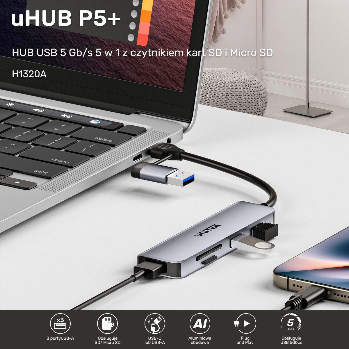 uHUB P5+ 5-w-1 USB 5Gbps Hub z czytnikiem kart SD i Micro SD
