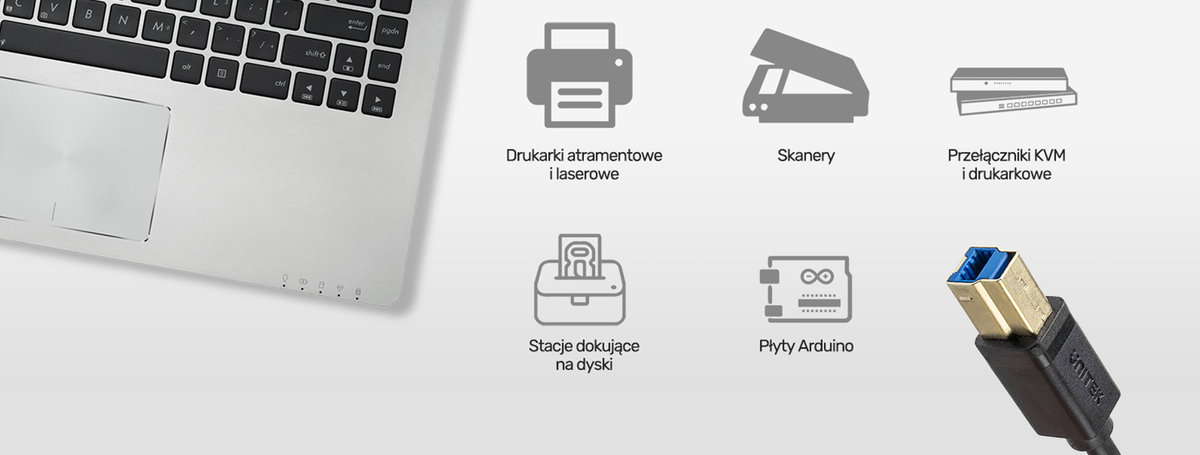 Poza szybkim transferem danych przewód umożliwia zasilanie i ładowanie podłączonych urządzeń. Jest kompatybilny także z płytami Arduino i przełącznikami KVM. Uwaga: Wtyk USB typu B w standardzie USB 3.0 jest nieco większy niż tradycyjny w standardzie 2.0.