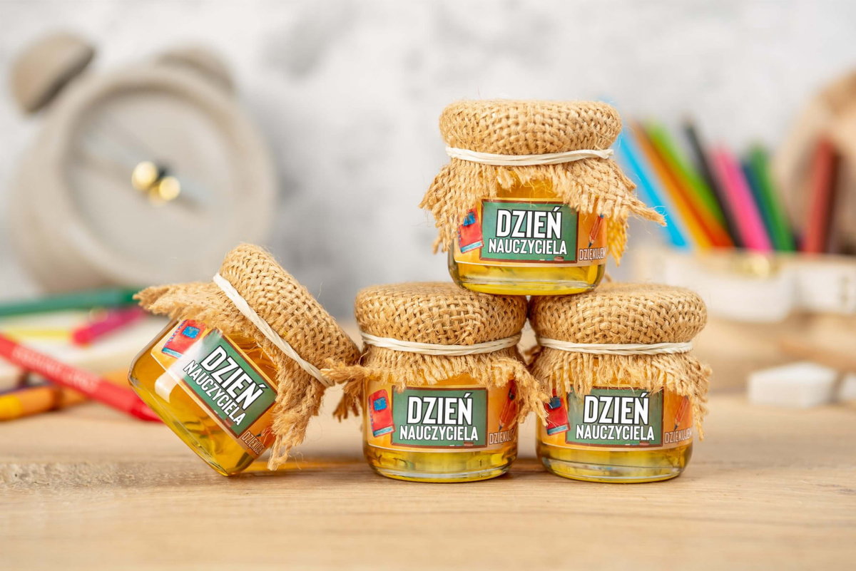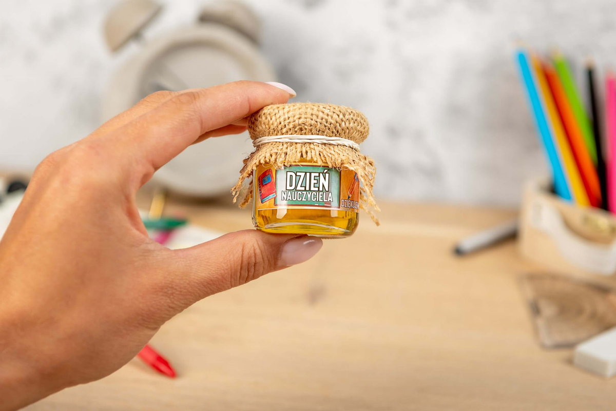 Upominek na dzień nauczyciela miodek z kapturkiem jutowym 40 g Świetny pomysł jako drobny upominek z okazji dnia nauczyciela! Przedmiot oferty: Ozdobny słoiczek 40 ml wypełniony ...