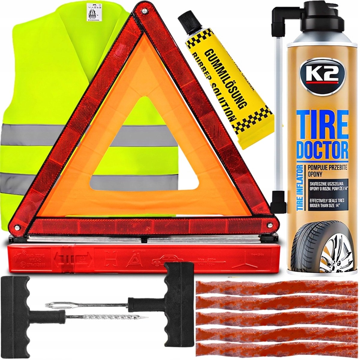 ✅ ZESTAW DO NAPRAWY OPON + USZCZELNIACZ K2 500ML + TRÓJKĄT OSTRZEGAWCZY + KAMIZELKA ODBLASKOWA