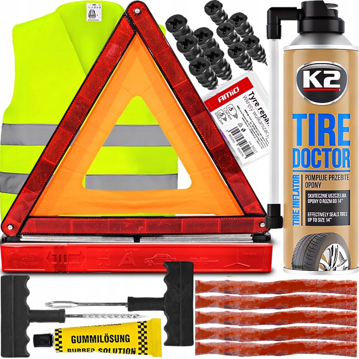 ✅ ZESTAW DO NAPRAWY OPON + USZCZELNIACZ K2 400ML + TRÓJKĄT OSTRZEGAWCZY + KAMIZELKA ODBLASKOWA + WKRĘTY WULKANIZACYJNE