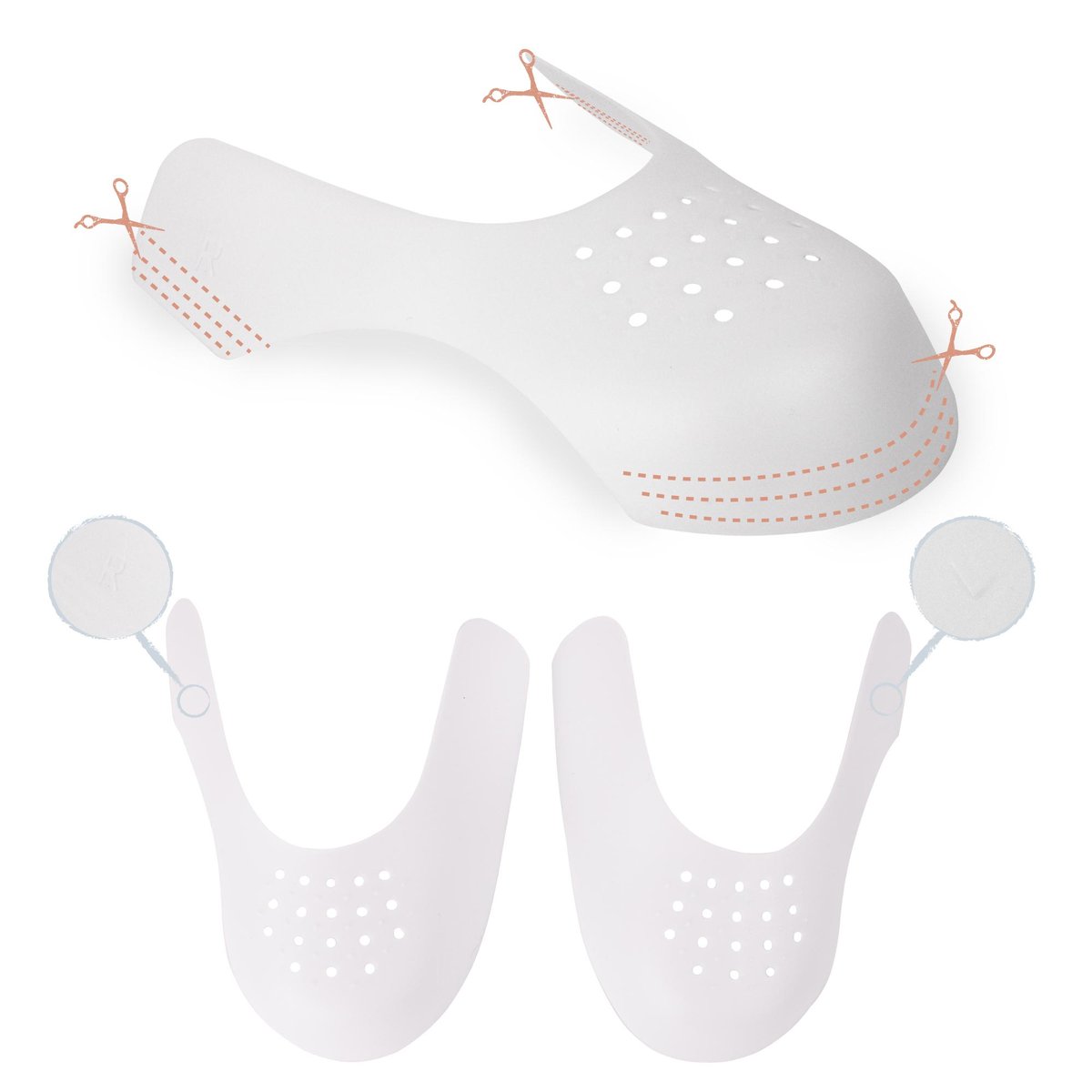 Usztywniacze mają wyznaczone linie do samodzielnego docięcia. Dopasowanie usztywniaczy jest bardzo łatwe, w kilka chwil, przy użyciu zwykłych nożyczek możesz zabezpieczyć buty przed marszczeniem i zapadaniem się czubków. Dodatkowo posiadają oznaczenia R (right- prawy), L (left- lewy) co umożliwi włożenie odpowiedniego usztywniacza do buta.