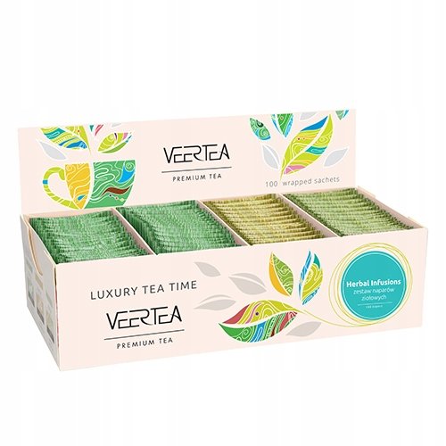 Naturalna herbata ekskluzywna Veertea. Saszetki zamknięte w kopertach - 100 sztuk. Zestaw 3 różnych herbatek ziołowych. VEERTEA to polska marka ekskluzywnych herbat ...
