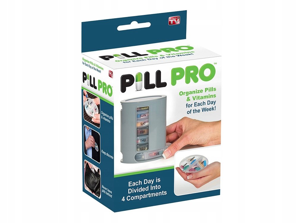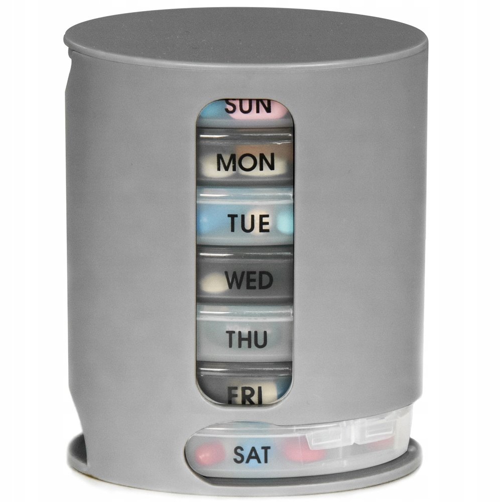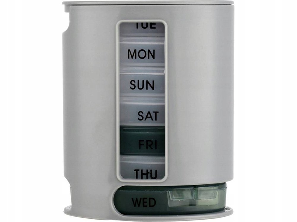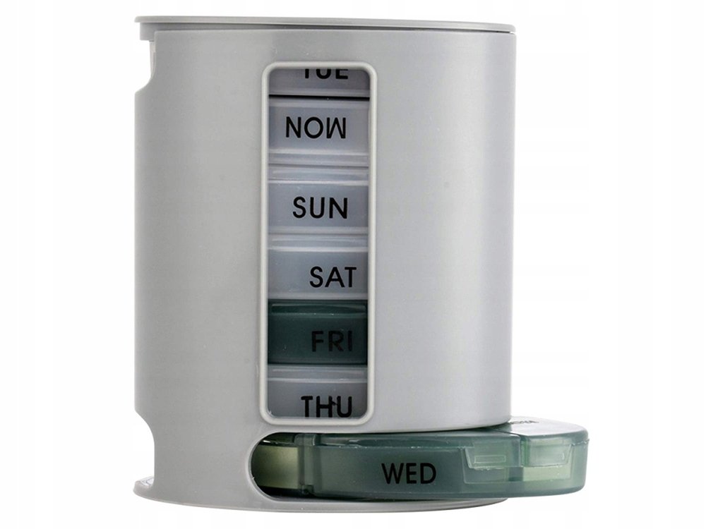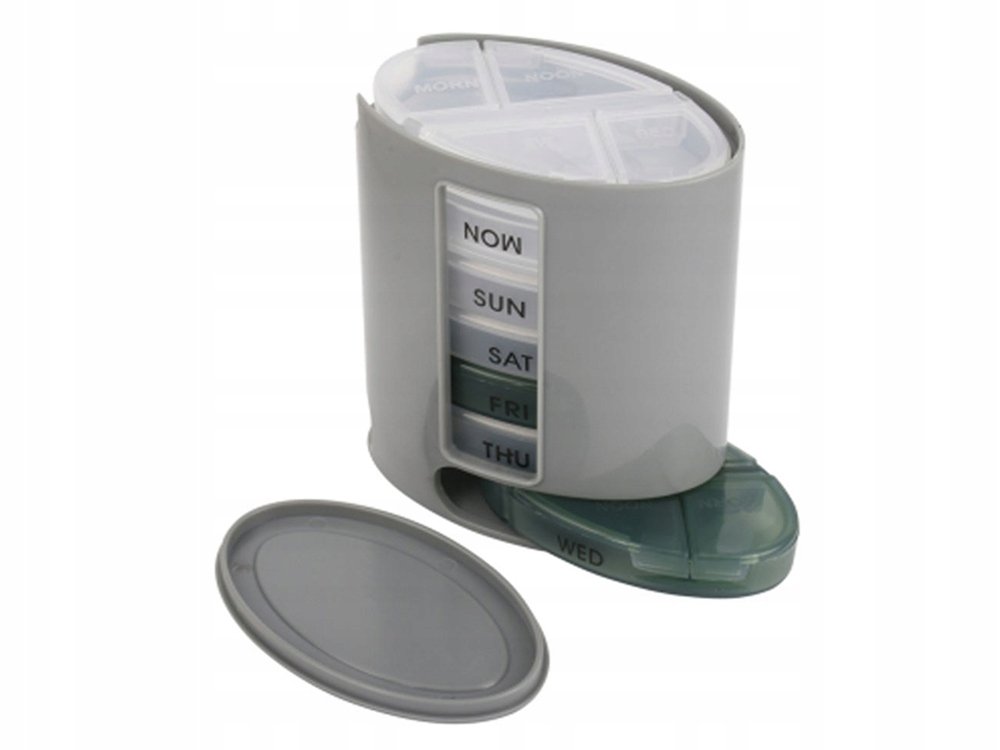 Każdy z pojemniczków posiada cztery przegródki na każdą porę dnia (rano, południe, wieczór, noc). Dzięki takiemu rozwiązaniu przygotujemy leki na cały tydzień, wystarczy wyciągnąć pojemnik ze spodu a po zażyciu dawki odłożyć go na górę . Pojemniczki podpisane są nazwą dnia tygodnia (w języku angielskim)