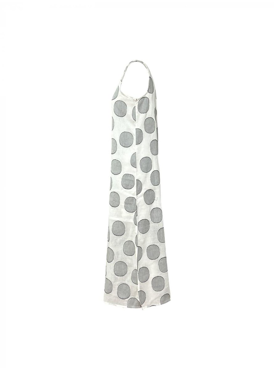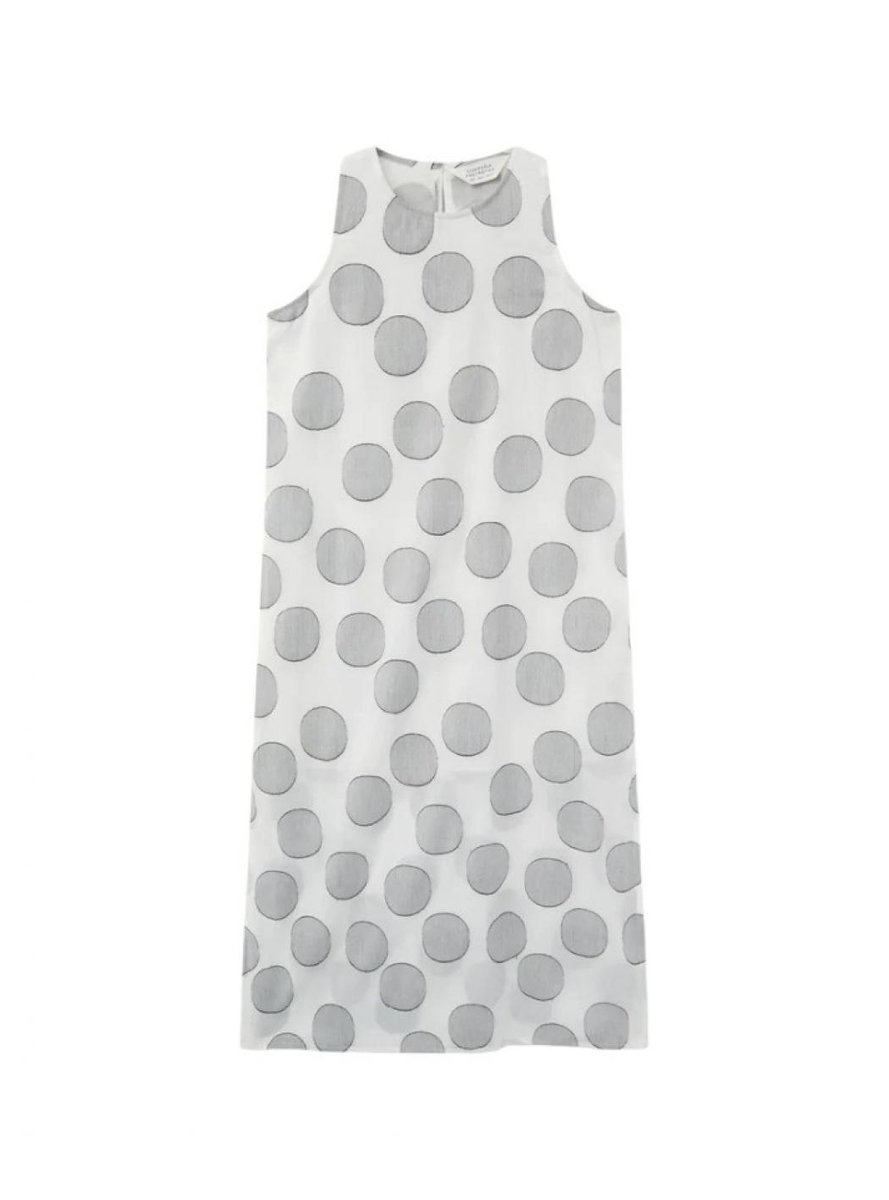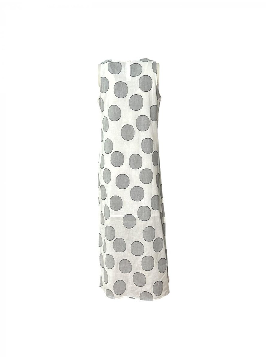 Abito lungo in jacquard con stampa a cerchi bianchi. Con scollo rotondo e senza maniche. Modello dal taglio dritto con spacchi laterali. Chiusura posteriore con apertura e bottone.
