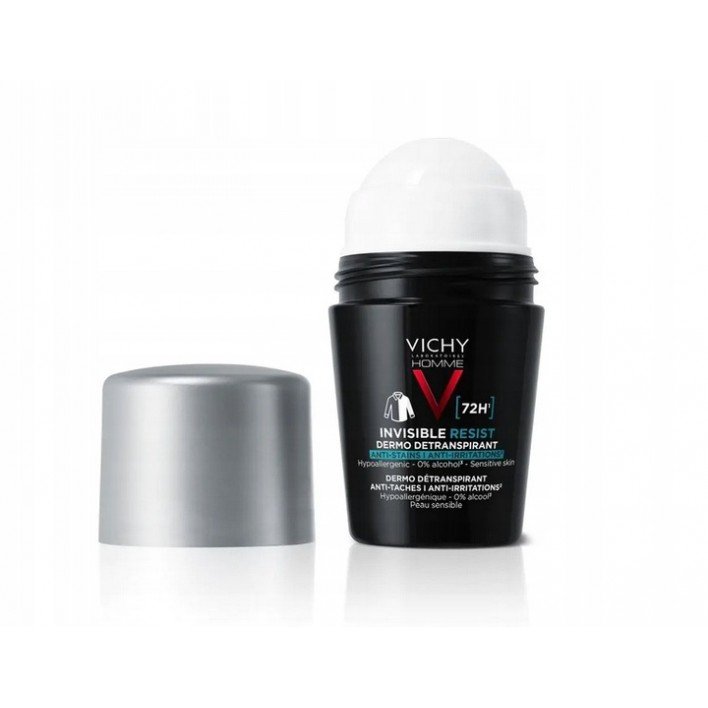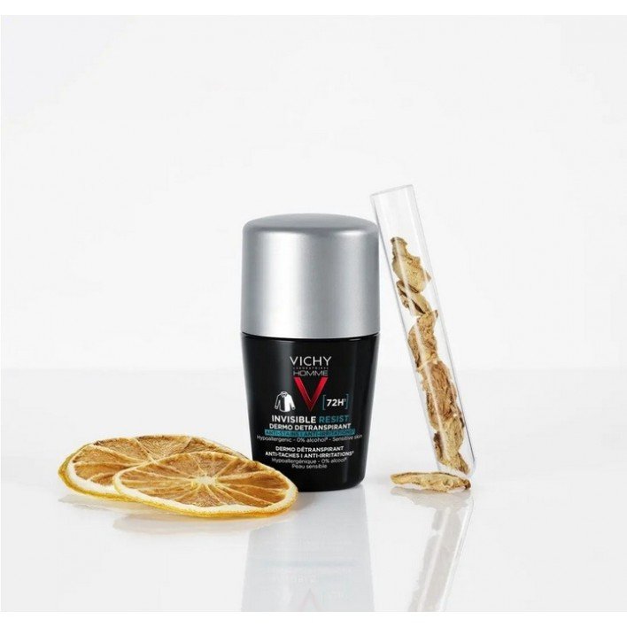 Vichy Homme Invisible Resist antyperspirant roll-on przeciw śladom. 72h* skuteczność działania. Hipoalergiczny. Odpowiedni dla skóry wrażliwej.