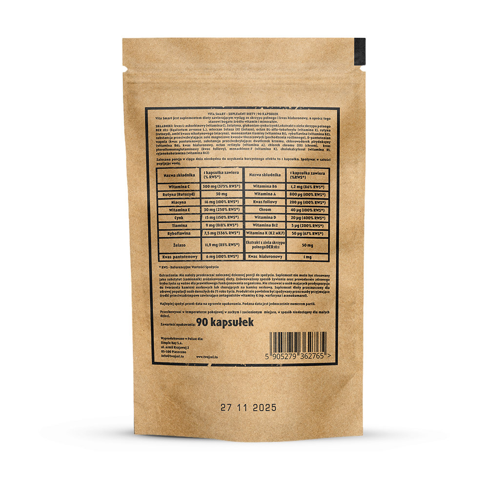 Każda kapsułka VITA SMART, to kompleks 18 różnych, specjalnie wyselekcjonowanych substancji aktywnych pomagających uzupełnić niedobory witamin i minerałów, będące skutkiem nieprawidłowo zróżnicowanej diety. VITA SMART jest suplementem diety zawierającym m.in. chrom, cynk, kwas foliowy, kwas hialuronowy, kwas pantotenowy, niacyne, rutyne, ryboflawine, wyciąg ze skrzypu polnego, tiamine, witamine A, witamine B12, witamine B6, witamine C, witamine D, witamine E, witamine K (K2 MK7) oraz żelazo.
