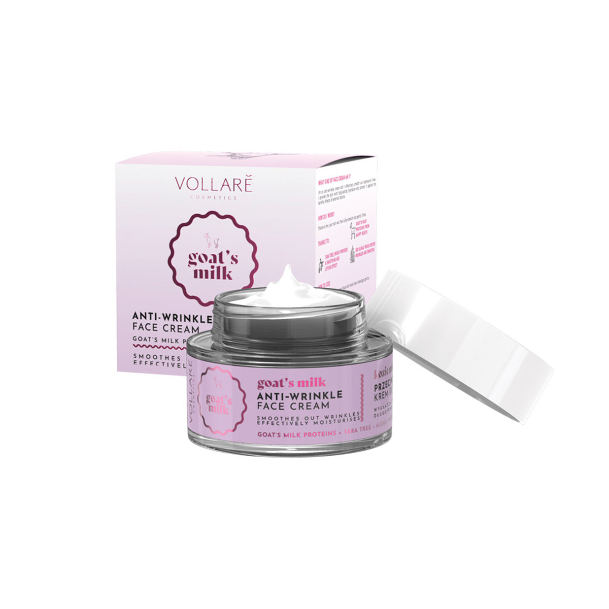 Przeciwzmarszczkowy krem do twarzy Kozie Mleko VOLLARÉ Cosmetics to gwarancja natychmiastowego efektu redukcji zmarszczek. Krem został wzbogacony o ekstrakty z czerwonej algi i drzewa tara. Wygładza zmarszczki i sprawia, że stają się mniej widoczne, chroni przed szkodliwymi czynnikami środowiska, długotrwale nawilża oraz redukuje oznaki zmęczenia i wyrównuje koloryt skóry. Dodatkowo proteiny z koziego mleka sprawiają, że cera pozostaje delikatnie napięta i jedwabiście gładka.