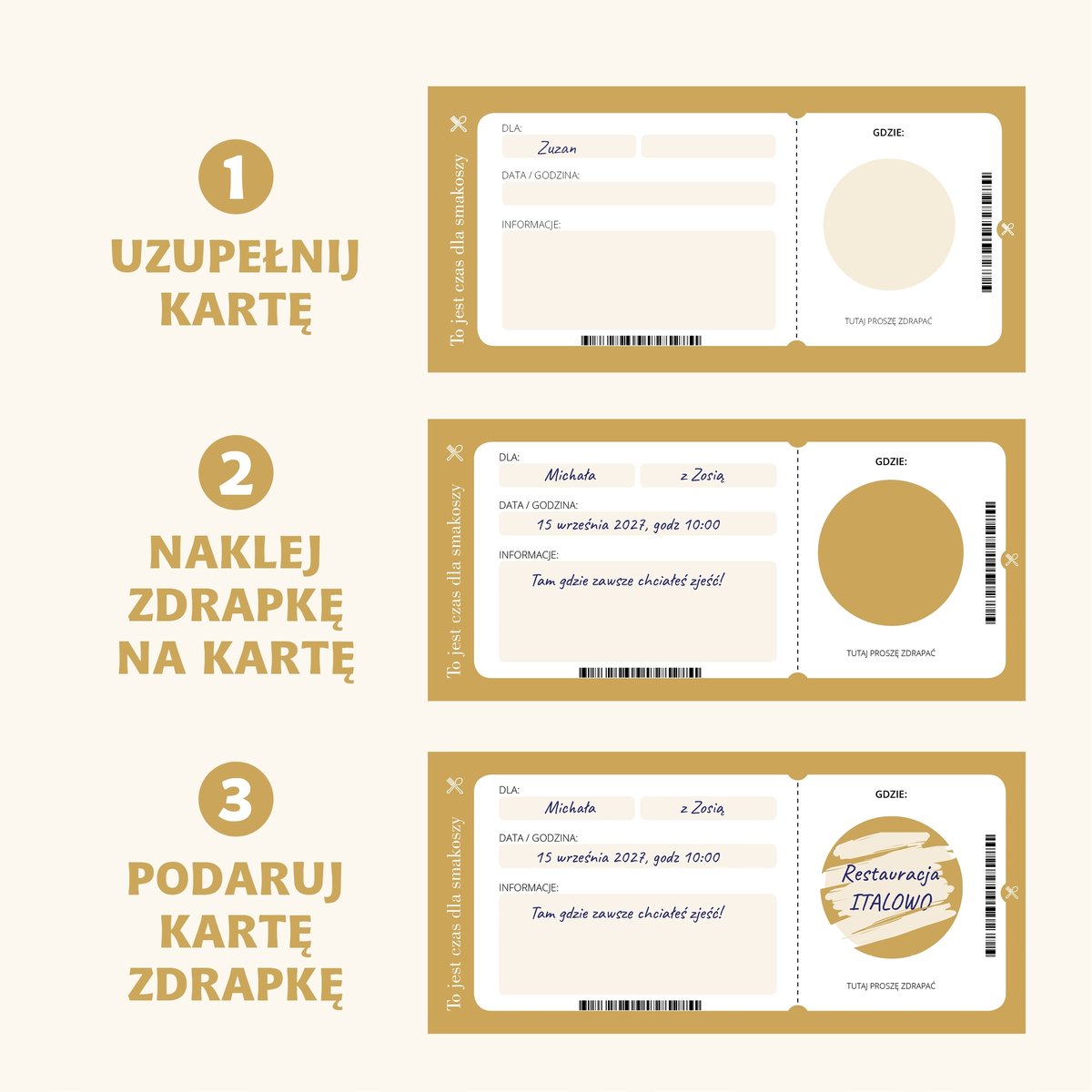 • Niespodzianka ukryta pod zdrapką – miejsce, do którego zostanie zaproszona obdarowana osoba, pozostaje tajemnicą aż do momentu zdrapania pola!