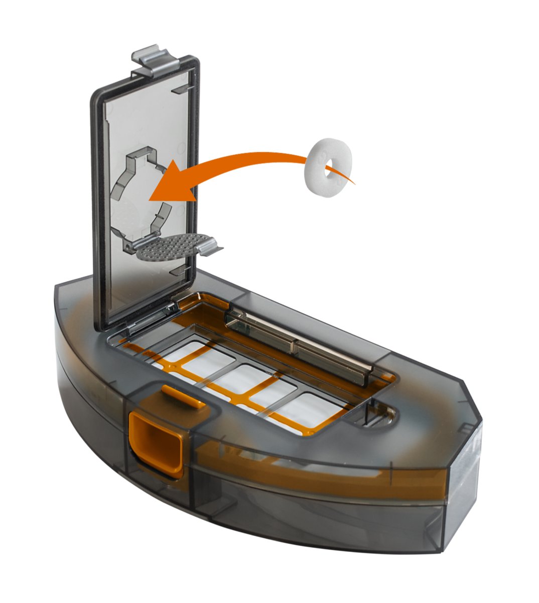 Odkurzacz VR3115 wyposażony jest w sprytnie zaprojektowaną komorę, w której można umieścić tabletkę zapachową. Podczas odkurzania eliminuje nieprzyjemne zapachy z nagromadzonego kurzu, sprawia, że pomieszczenie pachnie przyjemnie i daje poczucie większej czystości. Tabletka zapachowa nie jest dołączona do opakowania. Zalecamy wybierać zapachy do odkurzaczy o stałej konsystencji (sztyfty zapachowe, kółka, zapachy w granulkach w szczelnie zamykanych torebkach itp.).