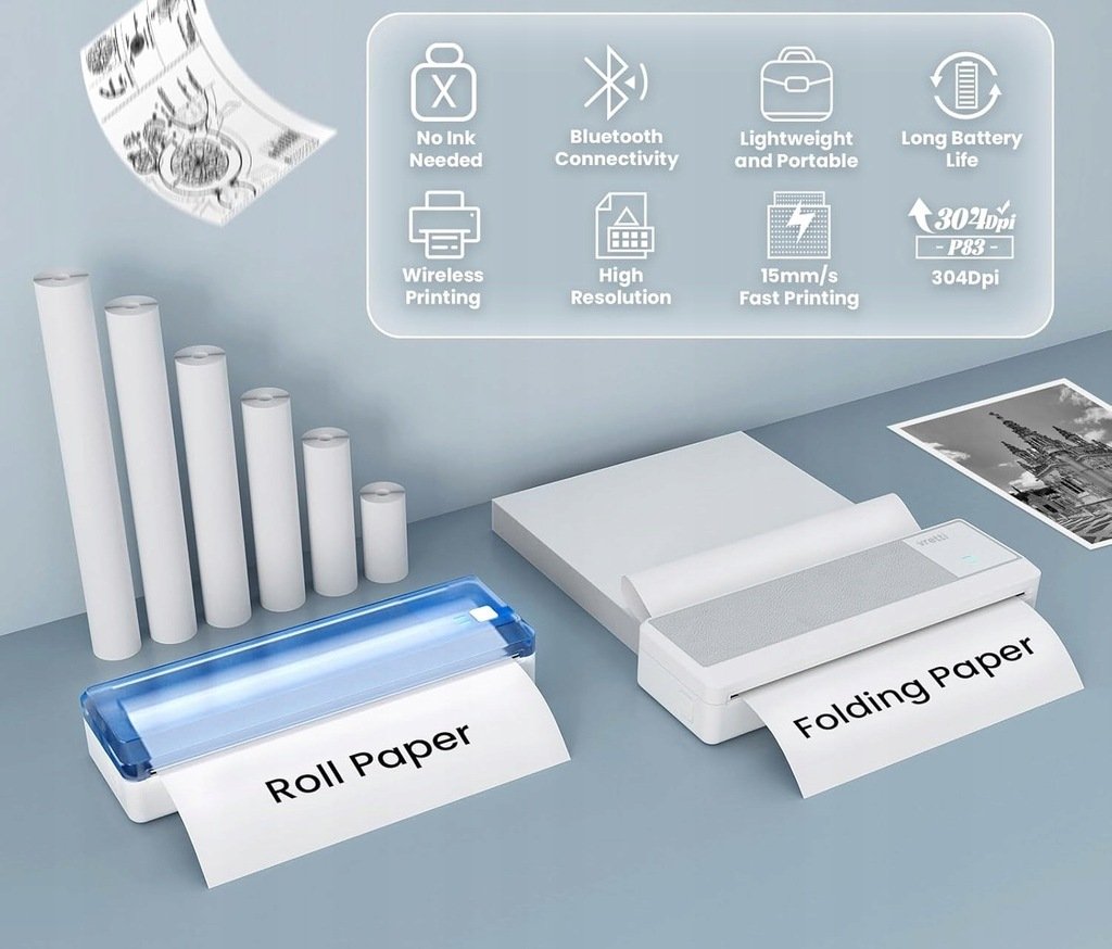 - Bez atramentu, bez problemów – Dzięki technologii druku termicznego nie wymaga tuszu ani tonera, co eliminuje ryzyko rozmazywania, zatykania się dysz i konieczności czyszczenia.