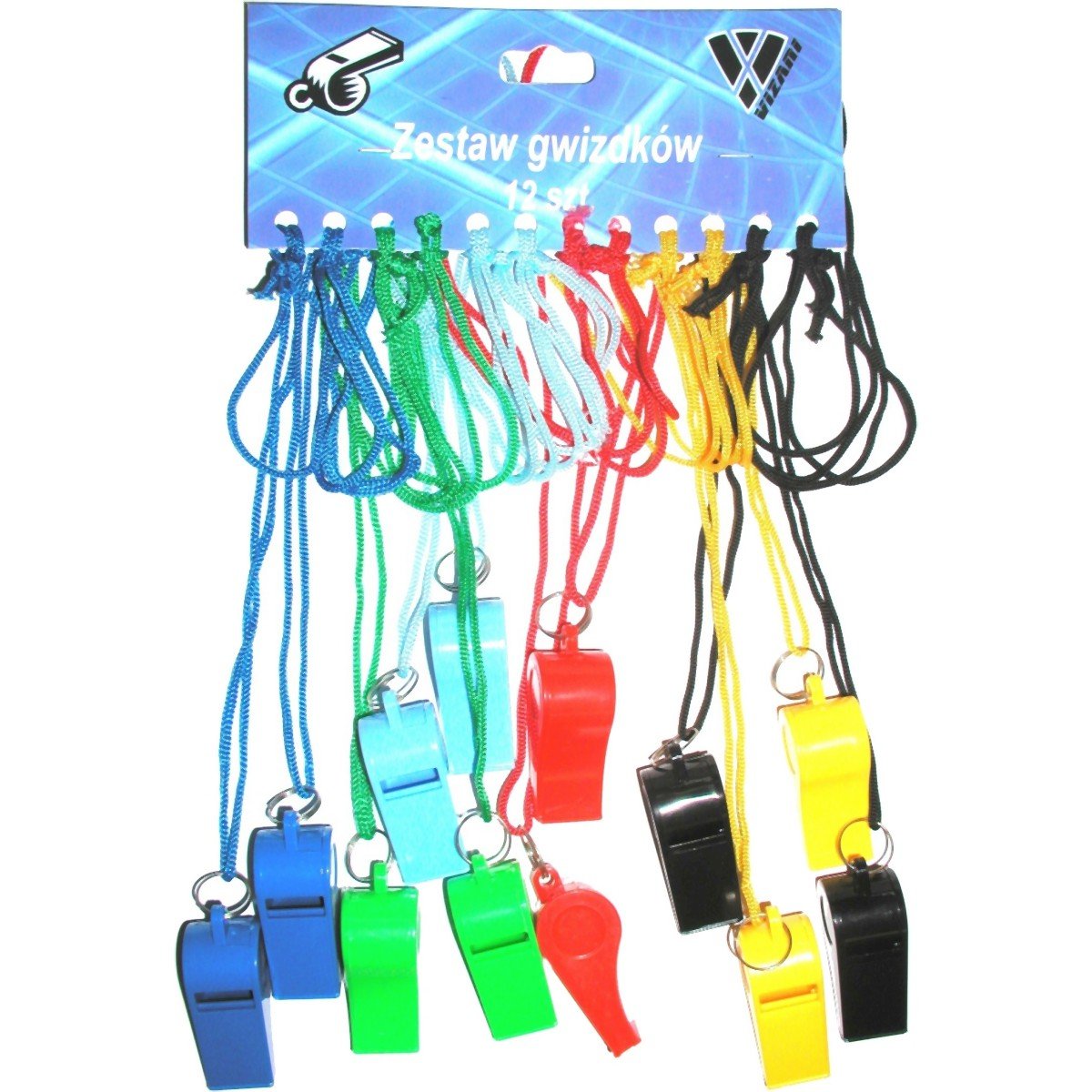 Komplet 12 sztuk gwizdków sportowych w różnych kolorach: żółty, zielony, jasny niebieski, ciemny niebieski, czerwony, czarny. Każdy z nich można powiesić na szyi, na fajnym, kolorowym sznurku.Gwizdki