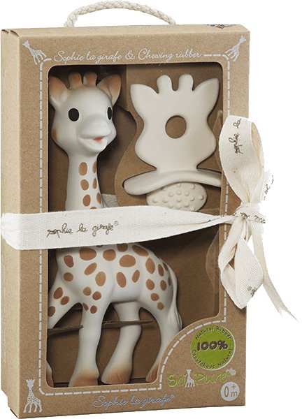 – klasyczny gryzak Żyrafa Sophie, o wysokości ok. 18 cm., wykonany w 100% z lateksu – z żywicy drzewa gumowego. Naturalne tworzywo, pokryte farbą spożywczą, jest bezpieczne do żucia, lekkie i elastyczne, co chroni przed bolesnymi urazami podczas machania. Obłe kształty są łatwe do uchwycenia dla małej rączki. Gryzak stymuluje i rozwija 5 zmysłów : wzrok – kontrastowe cętki, słuch – piszczałka umieszczona w brzuchu, dotyk – specyficzny dotyk kauczuku, gładki jak skóra mamy, zapach – szczególny zapach naturalnej gumy, pozwalający odróżnić gryzak w stosie innych zabawek, smak – główny zmysł poznawczy maluszka. Doskonałe remedium na ząbkowanie;