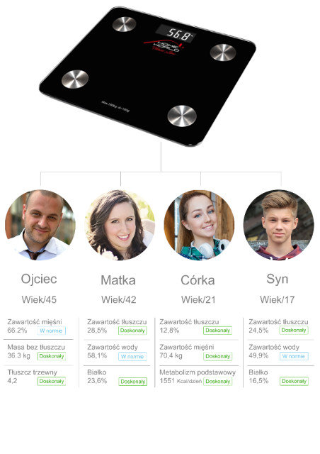 | Funkcje urządzenia: | pomiar tkanki tłuszczowej, pomiar masy mięśniowej, pomiar tkanki kostnej, pomiar zawartości wody, wskaźnik masy ciała BMI, wskaźnik przemiany materii BMR, pamięć |