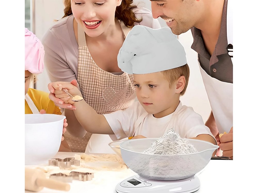 Elektroniczna waga kuchenna posiada czytelny wyświetlacz oraz miskę ułatwiającą ważenie towarów.